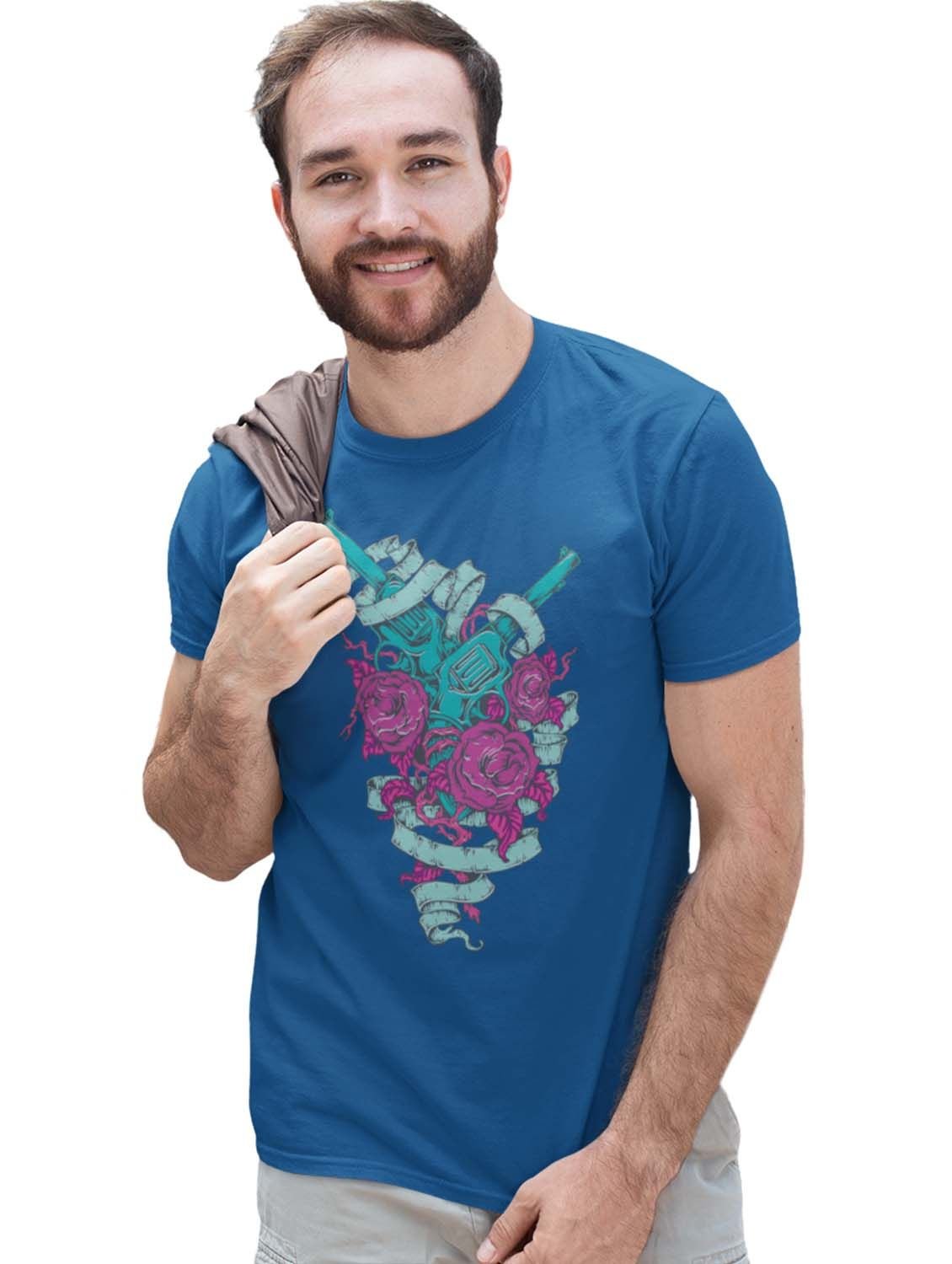 The Shooter And Roses Blue Round Neck Cotton Half Sleeved T-Shirt with Printed Graphics