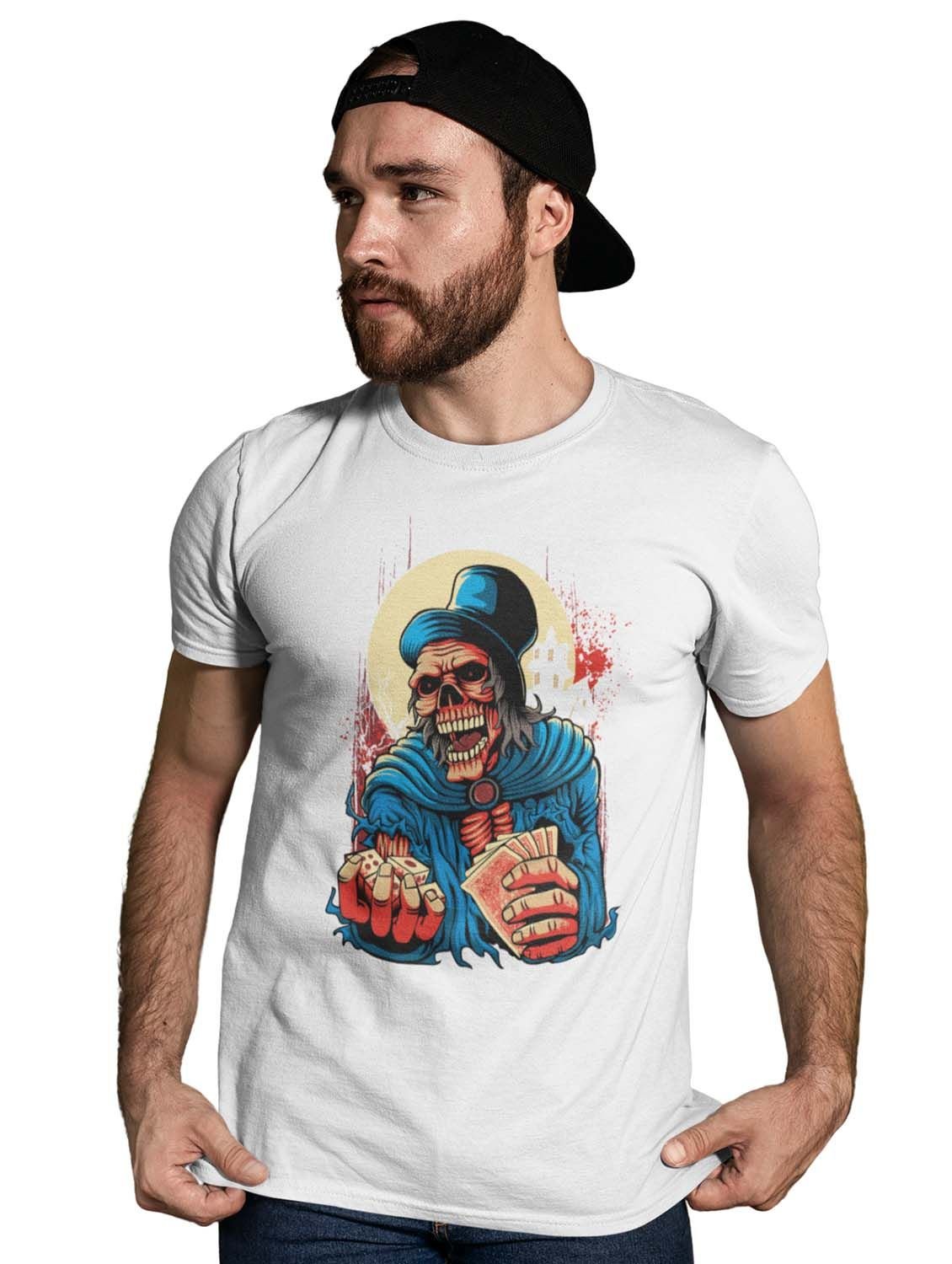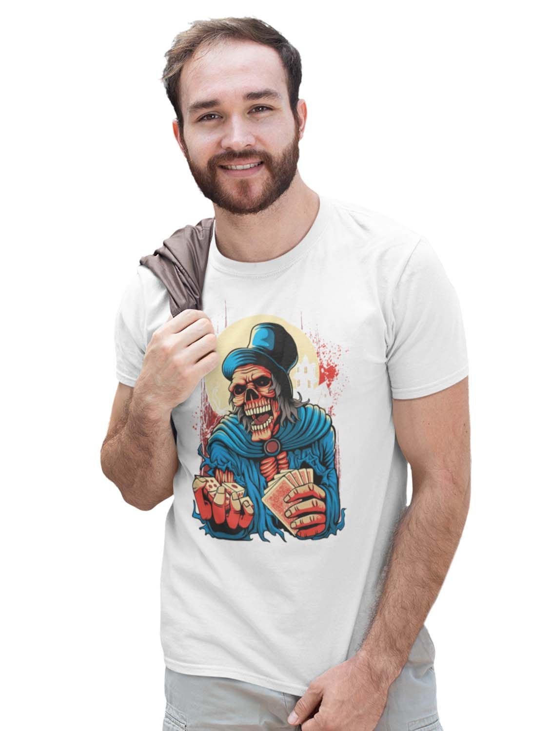 Cards Or Dices? White Round Neck Cotton Half Sleeved T-Shirt with Printed Graphics