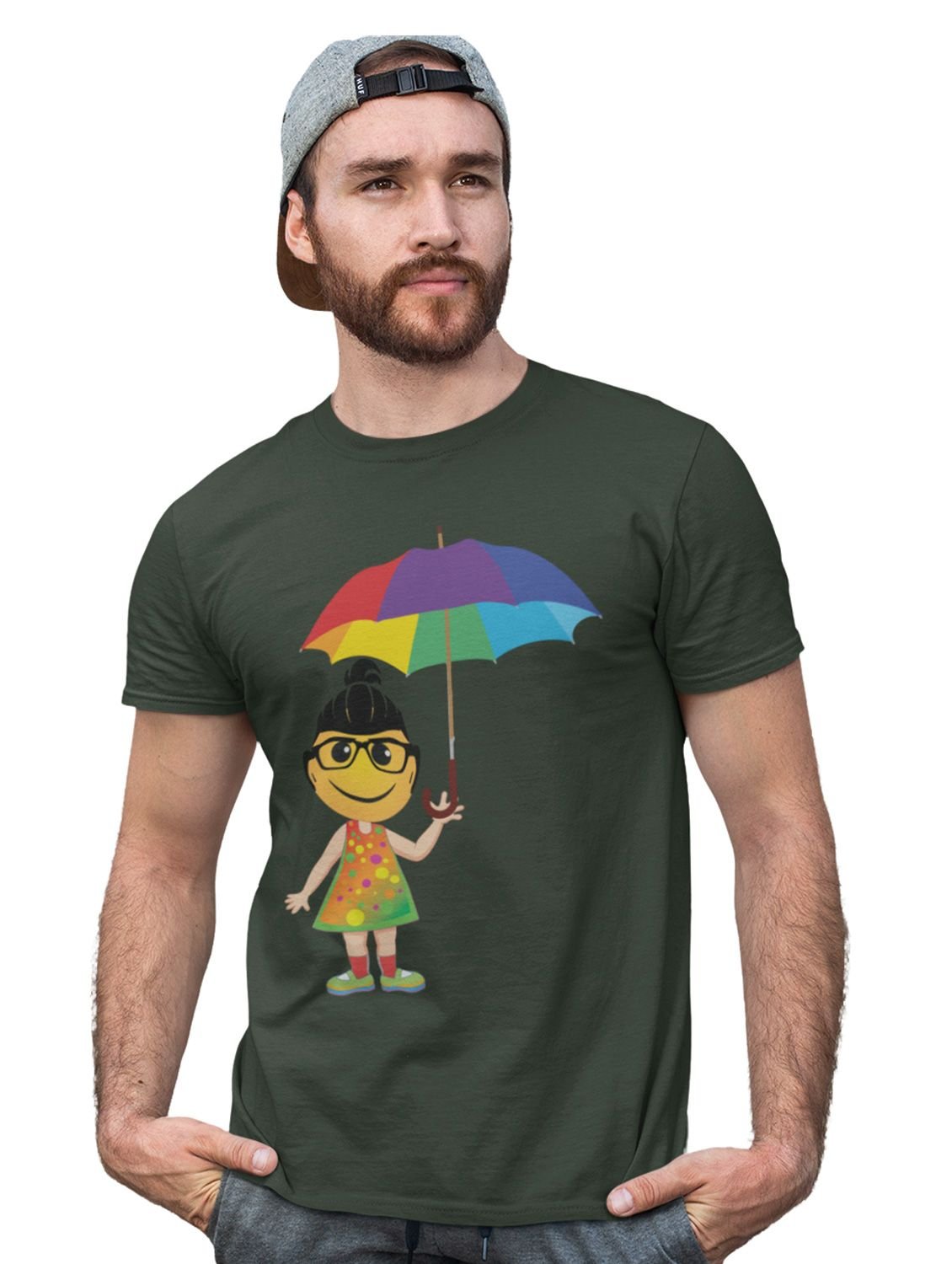 A Young Emoji Girl with Umbrella Printed T-shirt (Green) - Clothes for Emoji Lovers - Suitable for Fun Events- Foremost Gifting Material for Your Friends and Close Ones