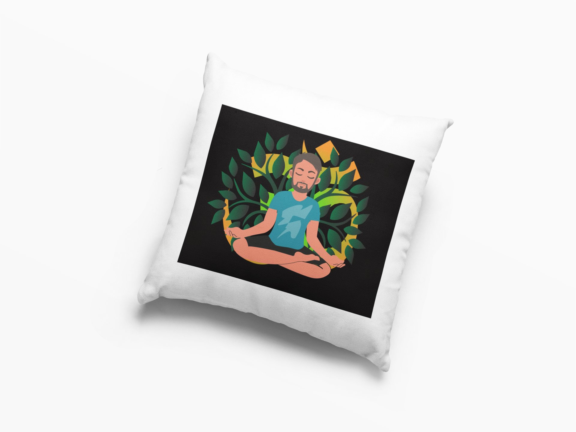 A Young Man - Cartoon - Sitting In Front Of Om Symbol, (BG Green And Yellow) -Printed Pillow Covers(Pack Of 2)