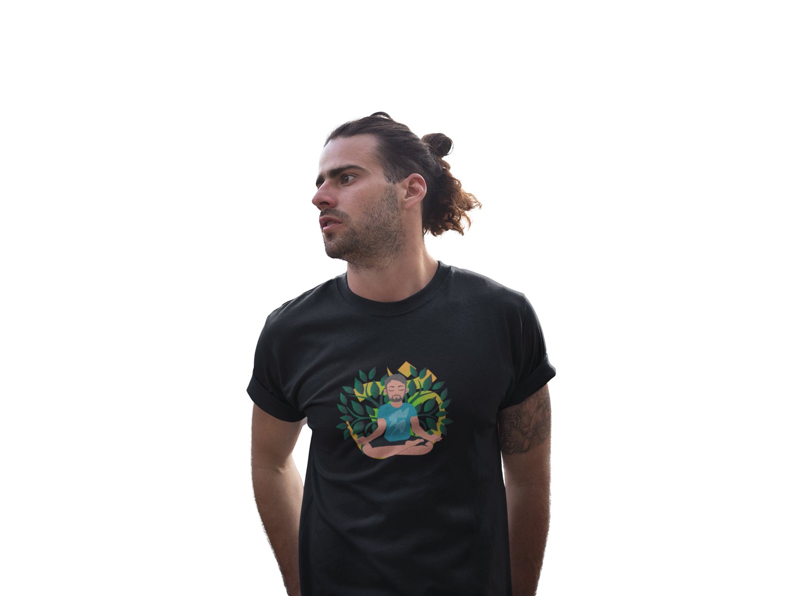 A Young Man - Cartoon - Sitting In Front Of Om Symbol, (BG Green And Yellow), Round Neck Tshirt - Clothes for Yoga Lovers - Suitable For Regular Yoga Going People - Foremost Gifting Material for Your Friends and Close Ones