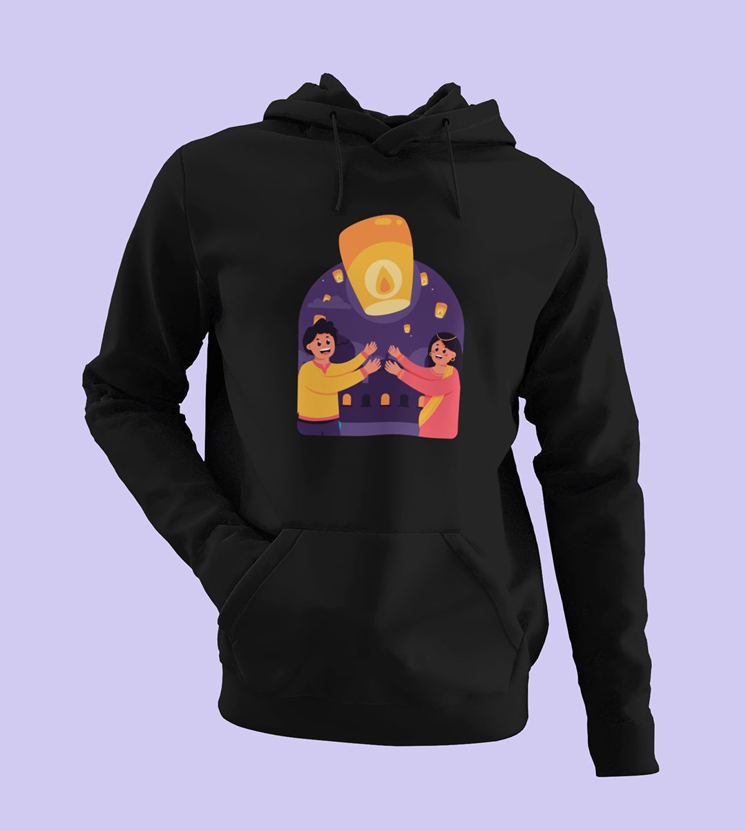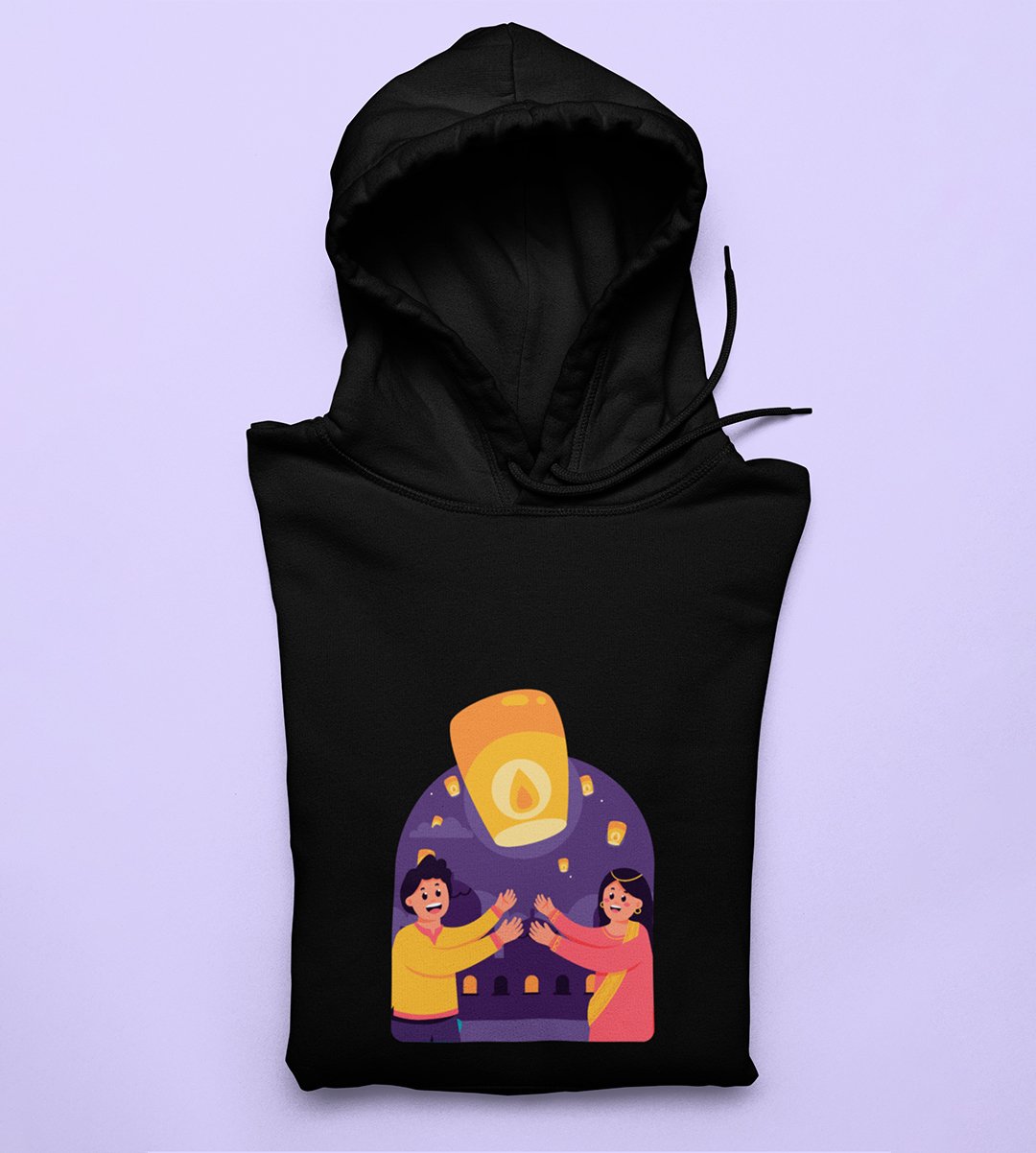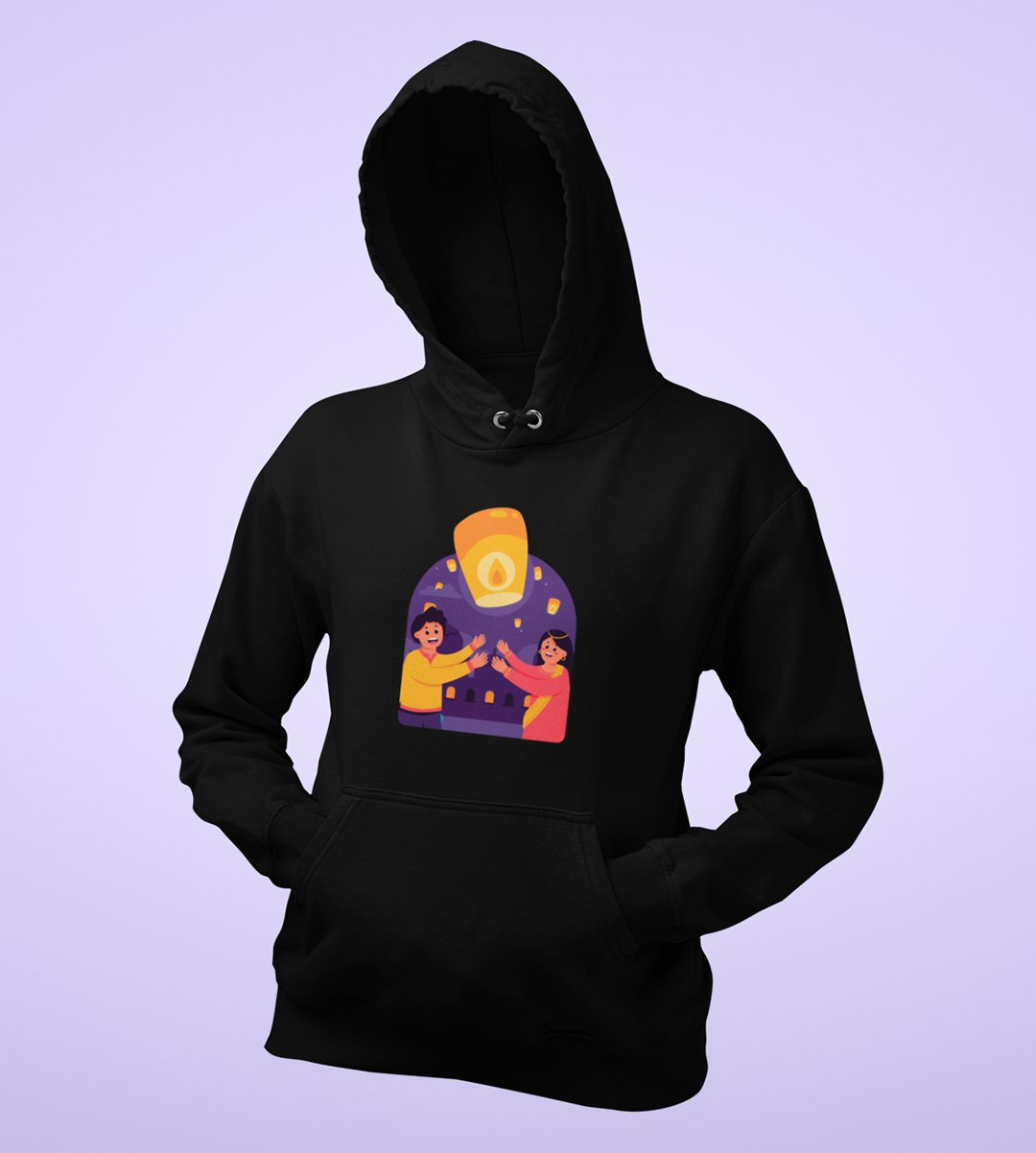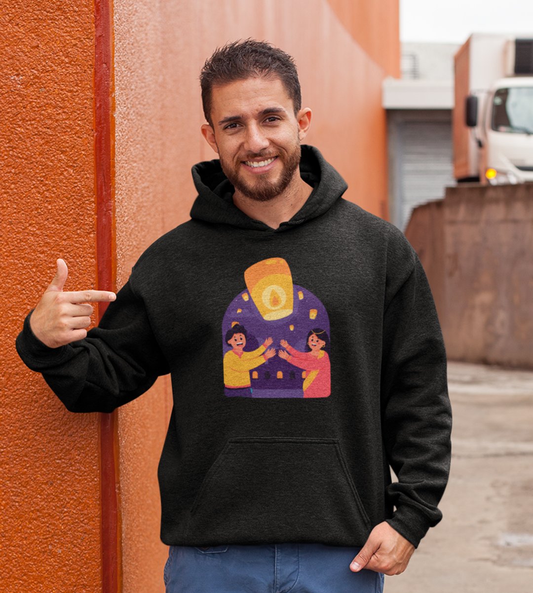 Illuminate your moments with the magic of Diwali night. Our Diwali Night Lantern black Hoodie features a charming design of a lantern soaring into the night sky, symbolizing the Festival of Light and Hope. Sip your favorite brew and let the warm glow of this black Hoodie brighten your day, just like the radiance of Diwali.