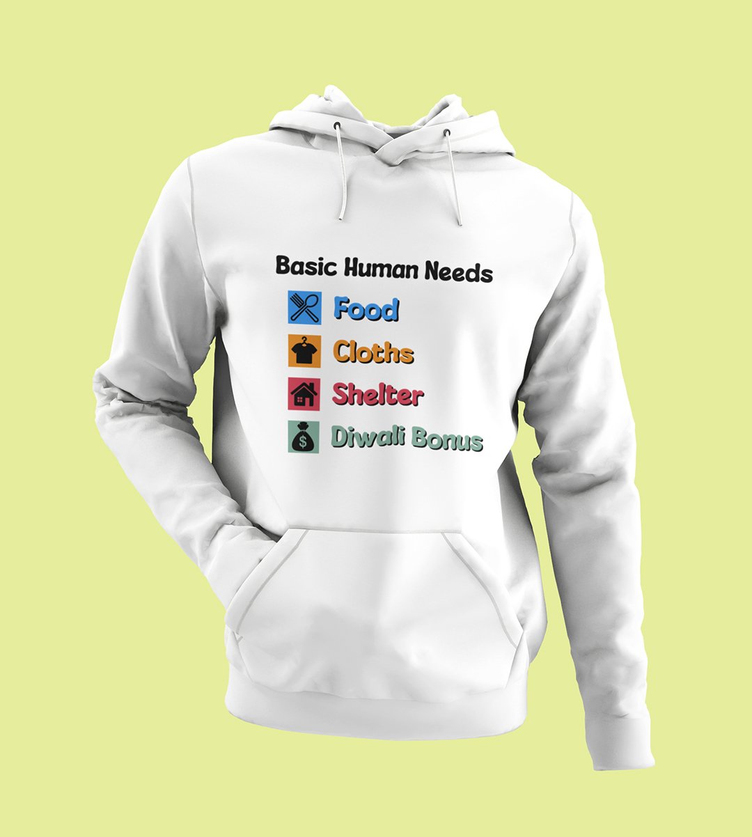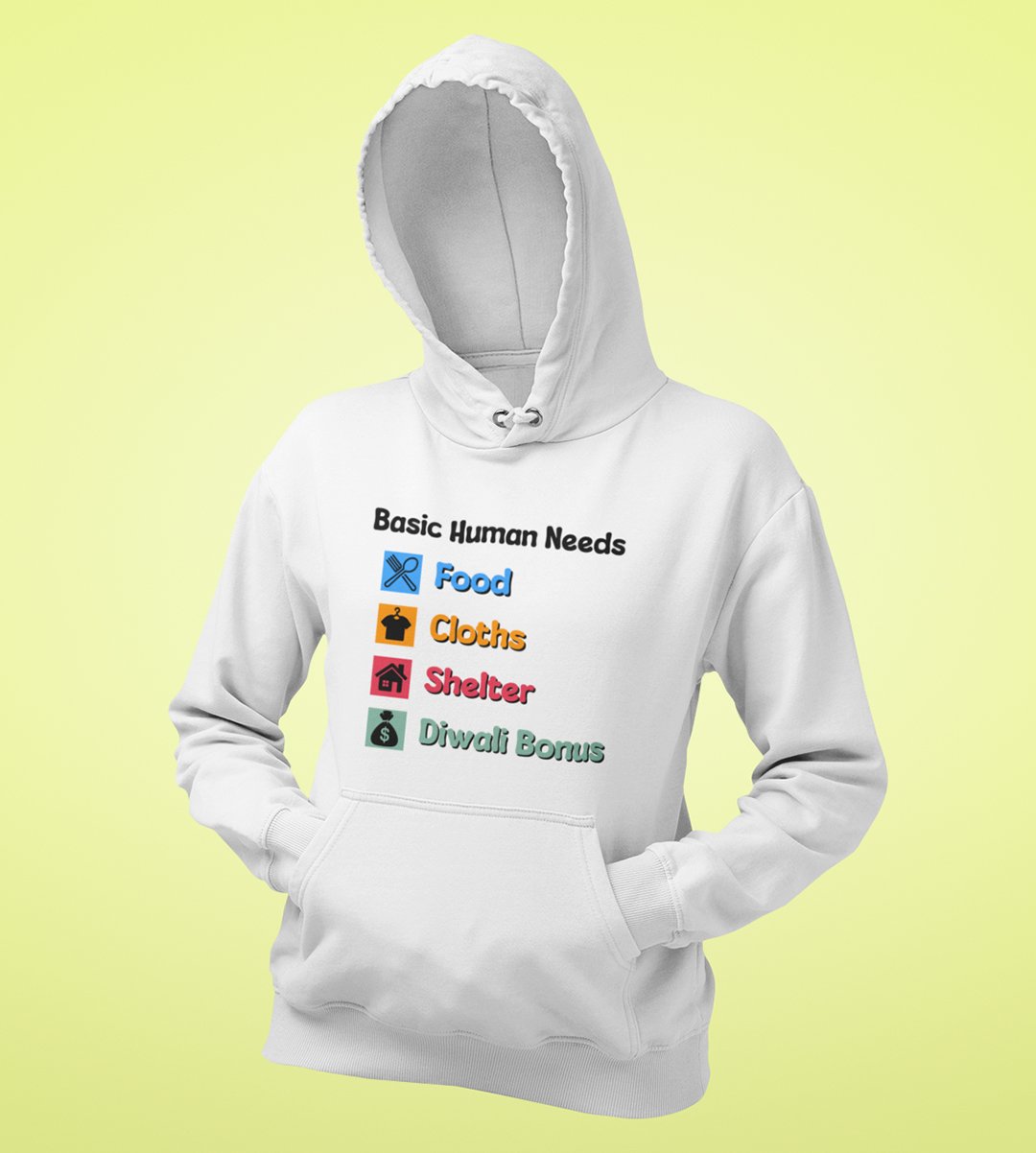 Basic human needs printed diwali themed White Hoodie specially for diwali festival