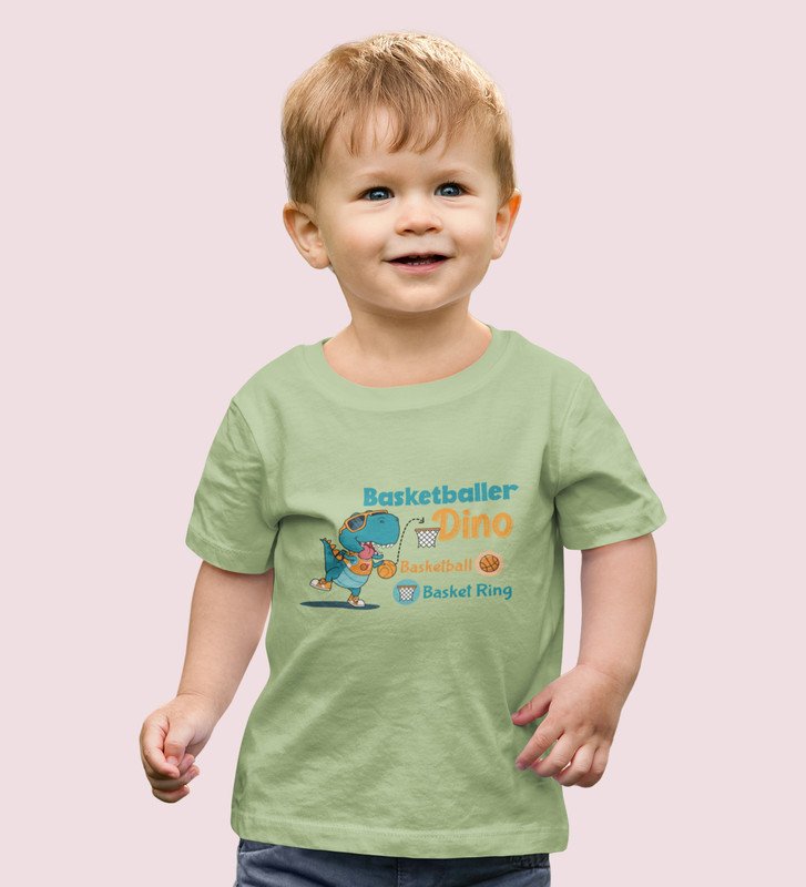 Basketballer Dino, Printed Cotton T-shirt (olive green) for Boys
