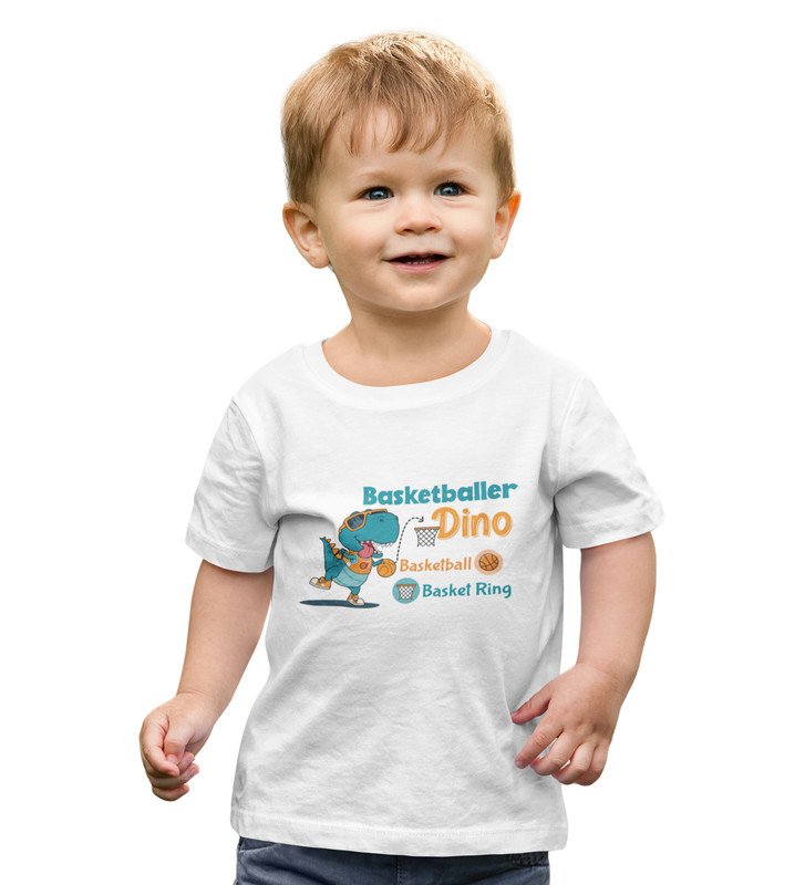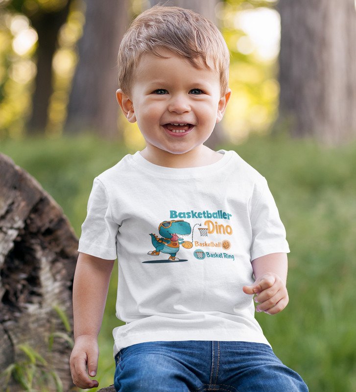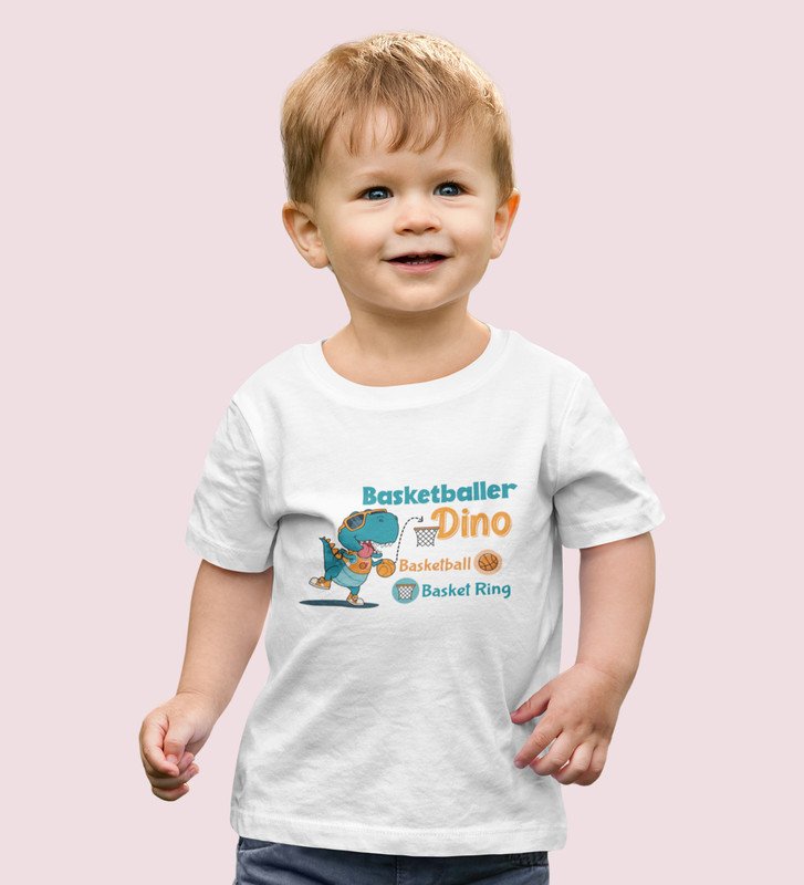 Basketballer Dino, Printed Cotton Tshirt (White) for Boys