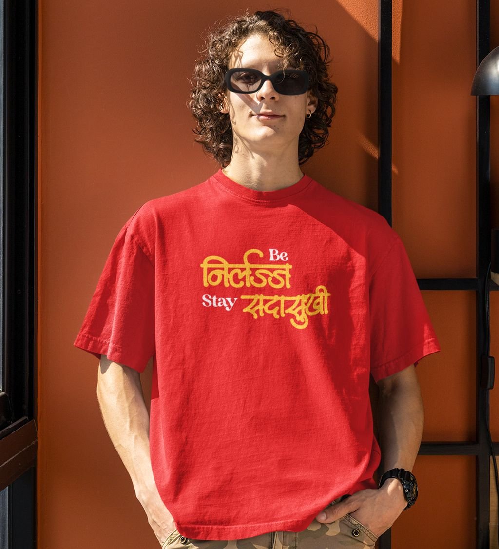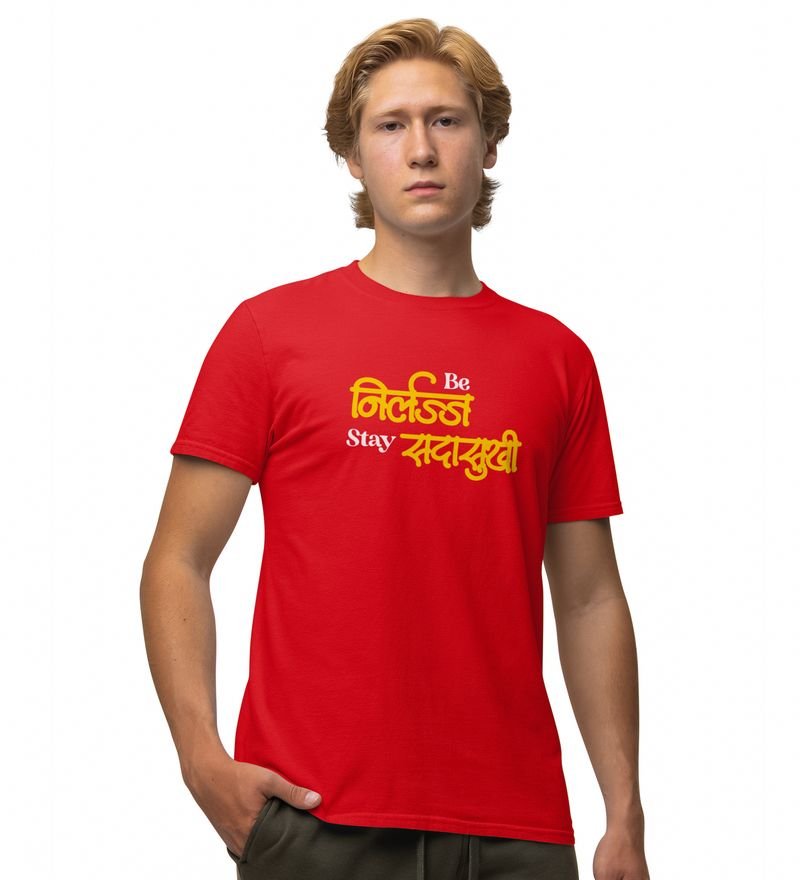 Be Shameless Stay Happy Red Round Neck Cotton Half Sleeved Mens T Shirt with Printed Graphics