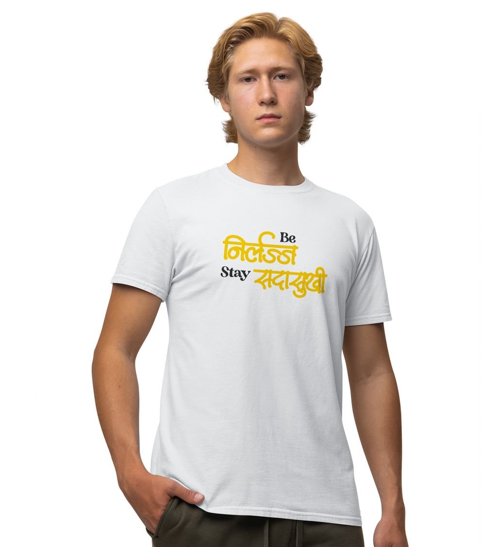 Be Shameless Stay Happy White Round Neck Cotton Half Sleeved Mens T Shirt with Printed Graphics