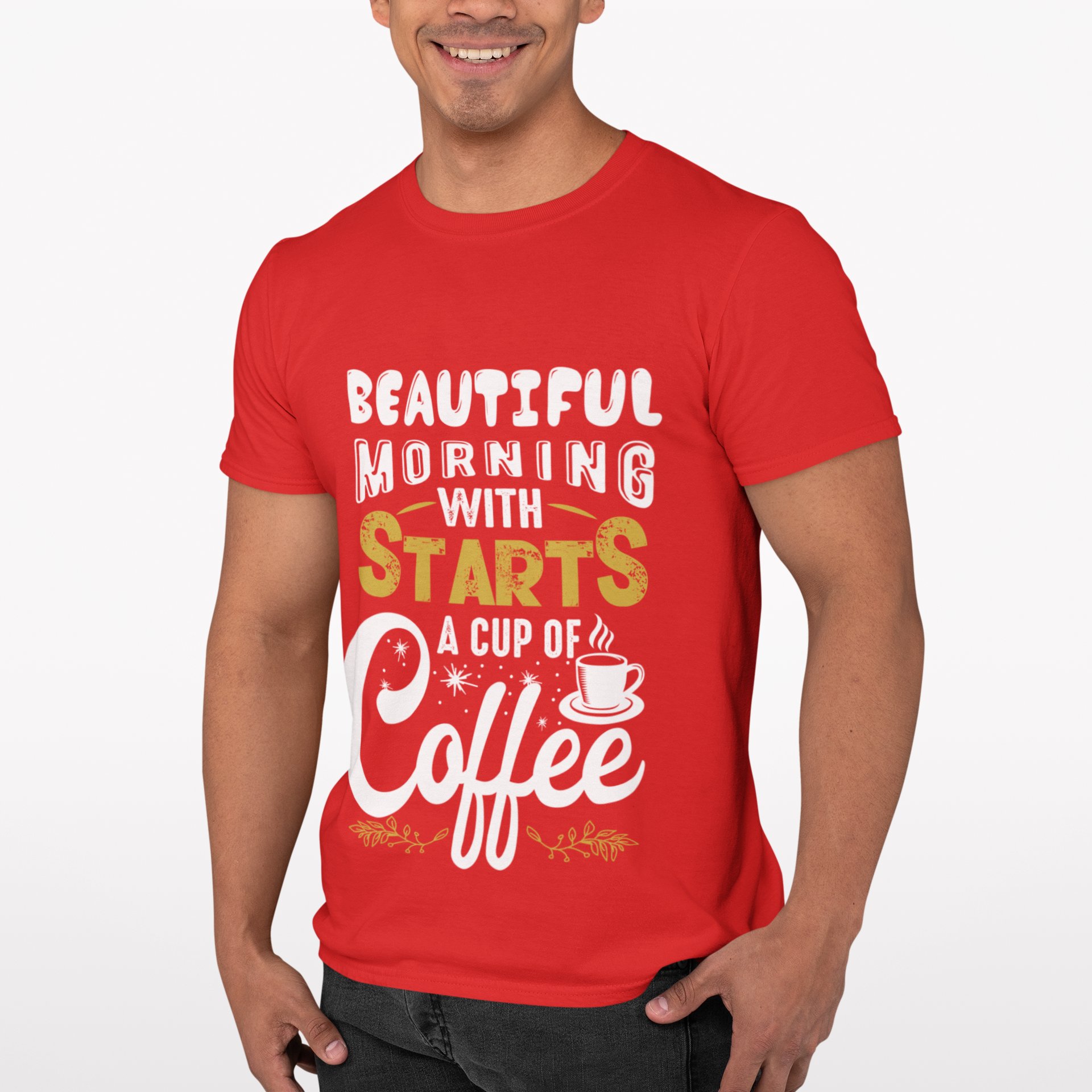 Beautifull mornings with starts a cup of Coffee - Red - printed t shirt - comfortable round neck cotton.