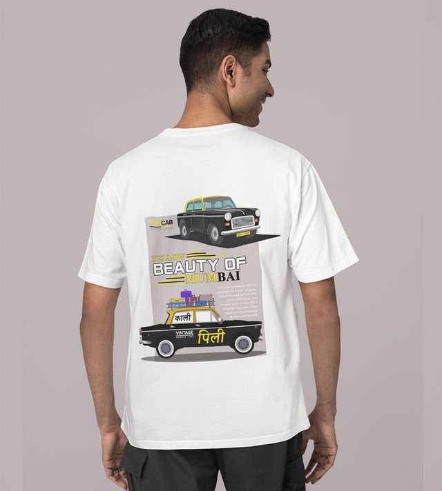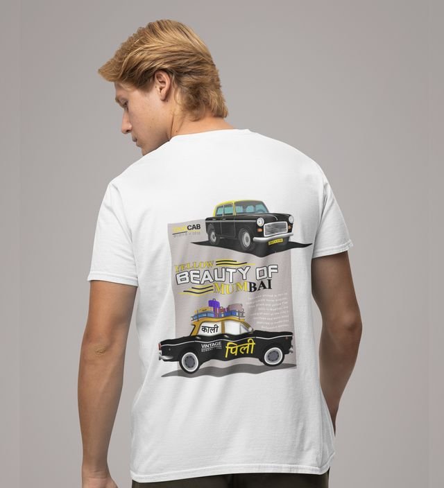 Beauty of Mumbai: in Yellow Black Taxi Graphic Printed White T-Shirt