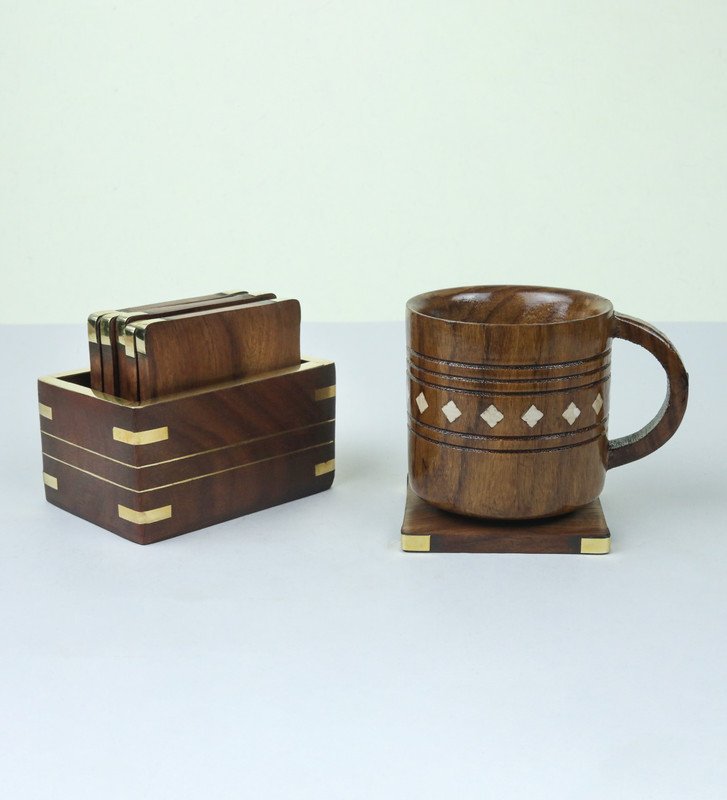 Best Wooden Handcrafted Square Coasters With Rectangle Wooden Case, For Beverages On Table- Set Of 5