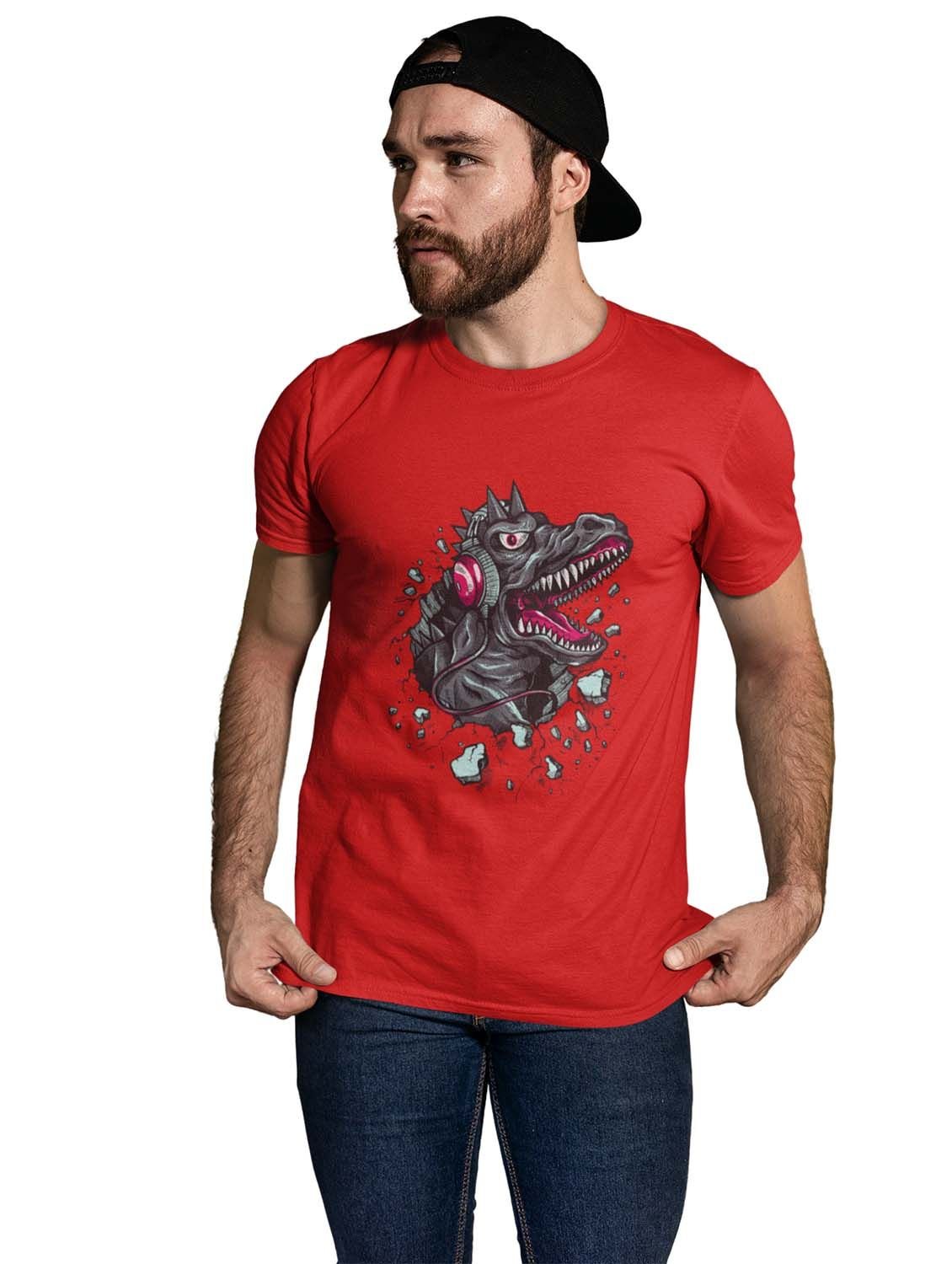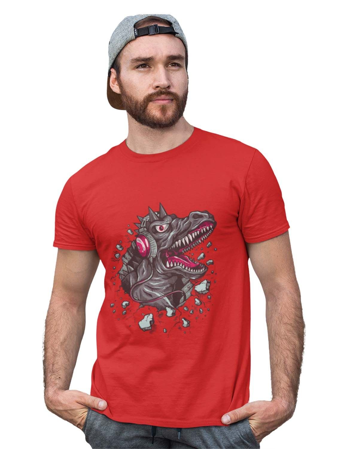 Dinasaur With Headphone Red Round Neck Cotton Half Sleeved T-Shirt with Printed Graphics