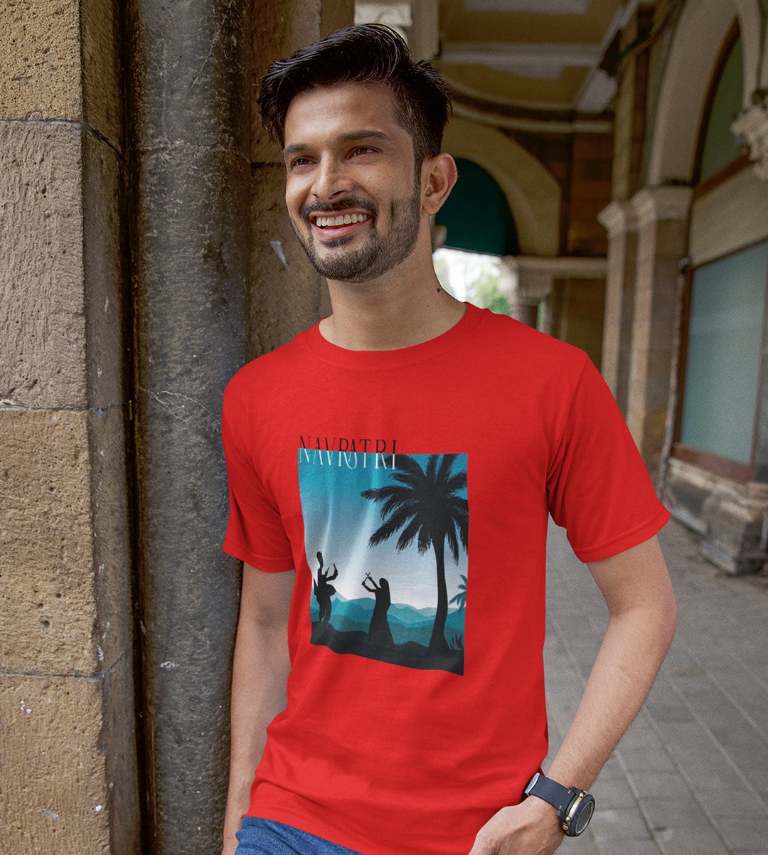 Navratri is a very auspicious festival for hindus. It takes place at the beginning of October and sometimes September. Enjoy the 9 days of festivities with full zeal and make yourself submerged in the love of Maa Durga. Navratri is also known as Durga Puja. And with this Tees, you can shine like a star during this festive season with our navratri themed cotton half sleeved Tshirts. You can pair our t-shirts with trousers and denim of your choice and make it a weekday smart casual or weekend wear. This is durable. This tshirt is smooth and soft which makes you comfortable to wear during all seasons. The printing in it is durable and odourless. It has five sizes, S,M,L,XL,XXL. The Tshirt colour is intact even after repeated washes. It can be kept in your wardrobe and hangers. Please avoid washing mashine to clean this Tee, it may affect the print. Hand wash only. We have brought you many navratri related designs printed on our different colour Tshirts to choose from. Grab it now.