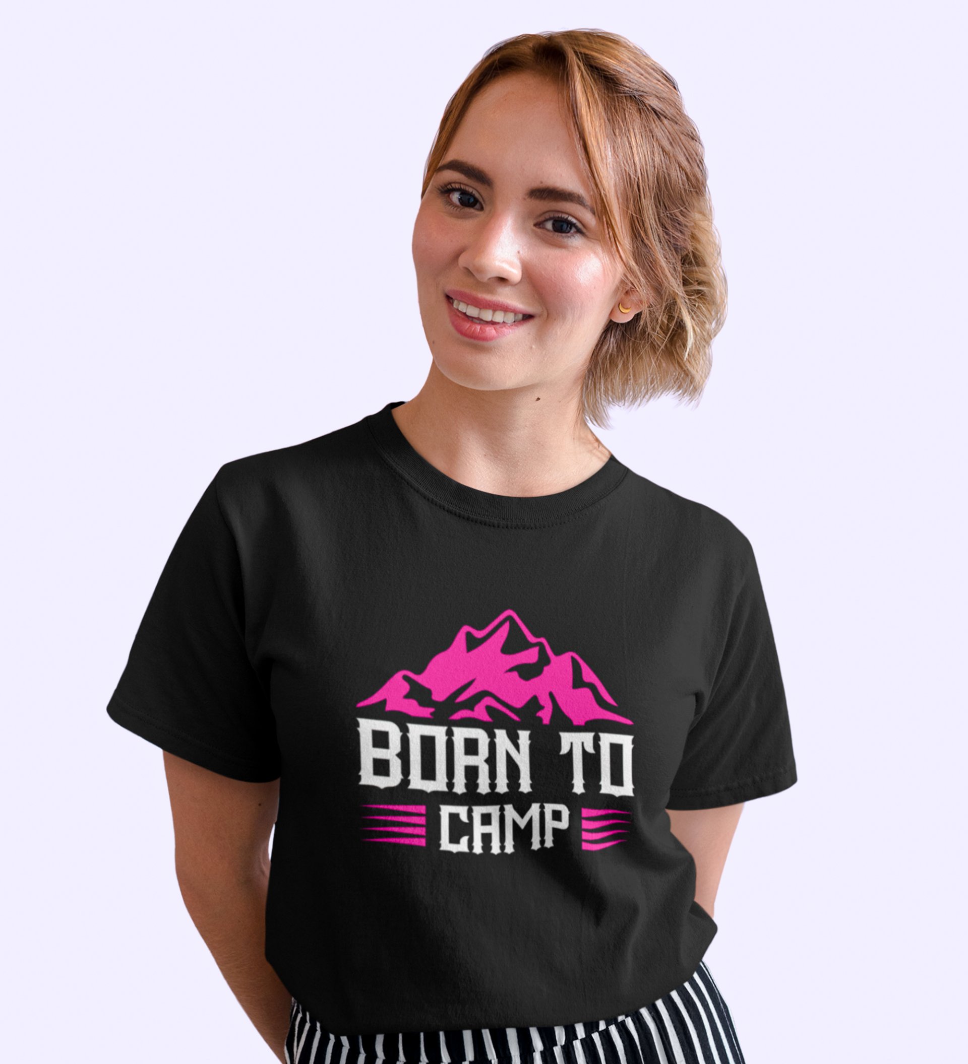 HopOfferBorn To Camp Black Round Neck Cotton Half Sleeved Women's T-Shirt with Printed Graphics