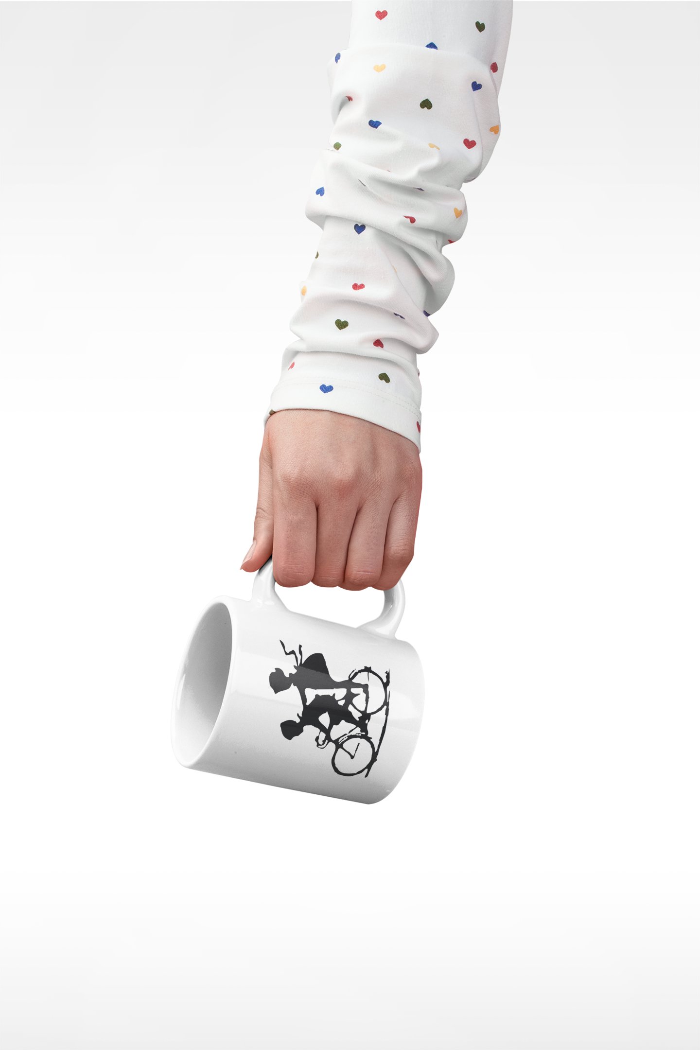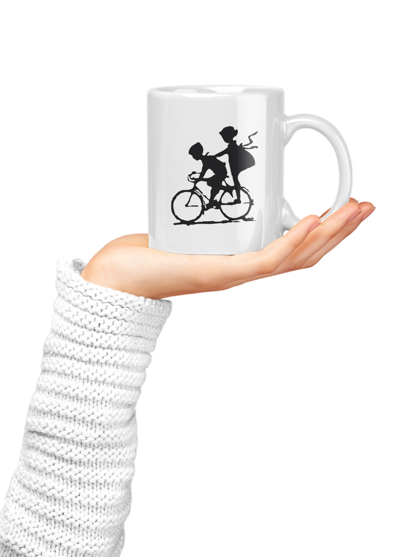 Boy and girl cycling together - family themed printed ceramic white coffee and tea mugs/ cups
