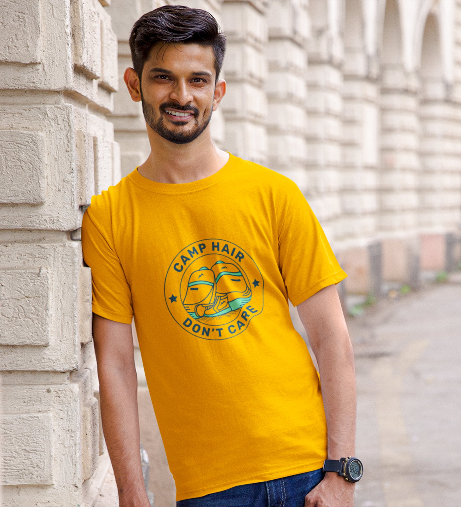 Camp hair dont care - Yellow Printed t-shirts - Clothes for travellers and riders -for mens - suitable for all kinds of Adventurous journey- best gifting item for friends and family.