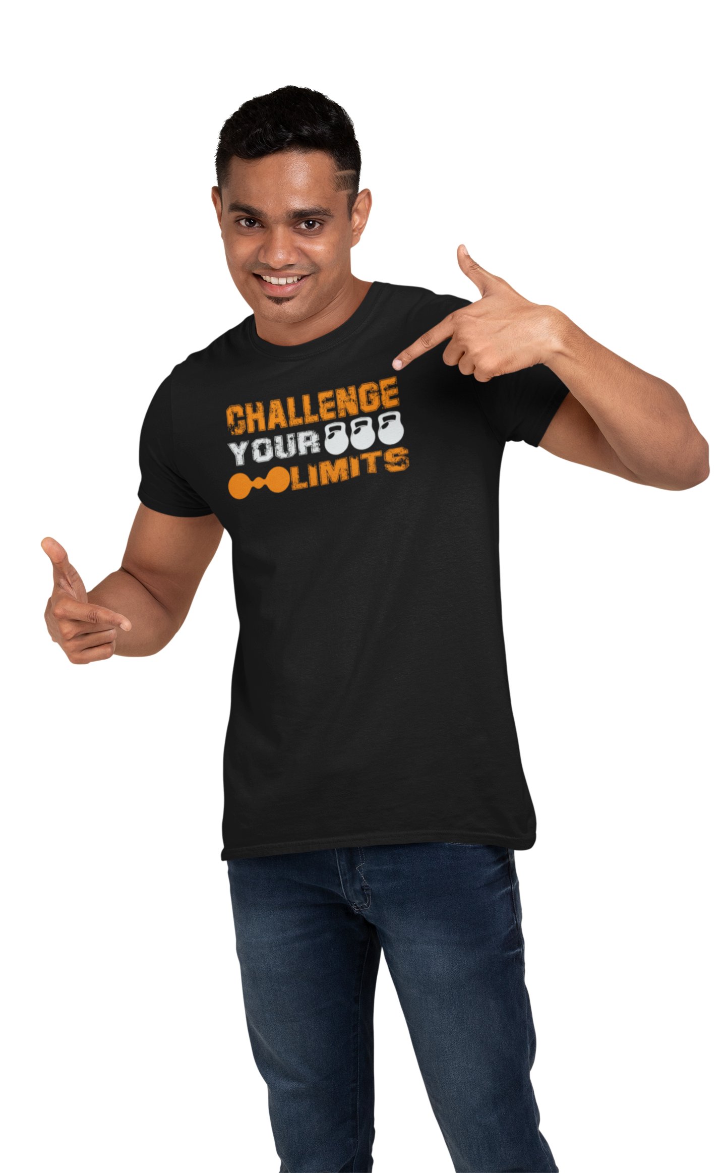 Challenge Your Limits, (BG Orange and White), Round Neck Gym Tshirt (White Tshirt) - Clothes for Gym Lovers - Suitable for Gym Going Person - Foremost Gifting Material for Your Friends and Close Ones