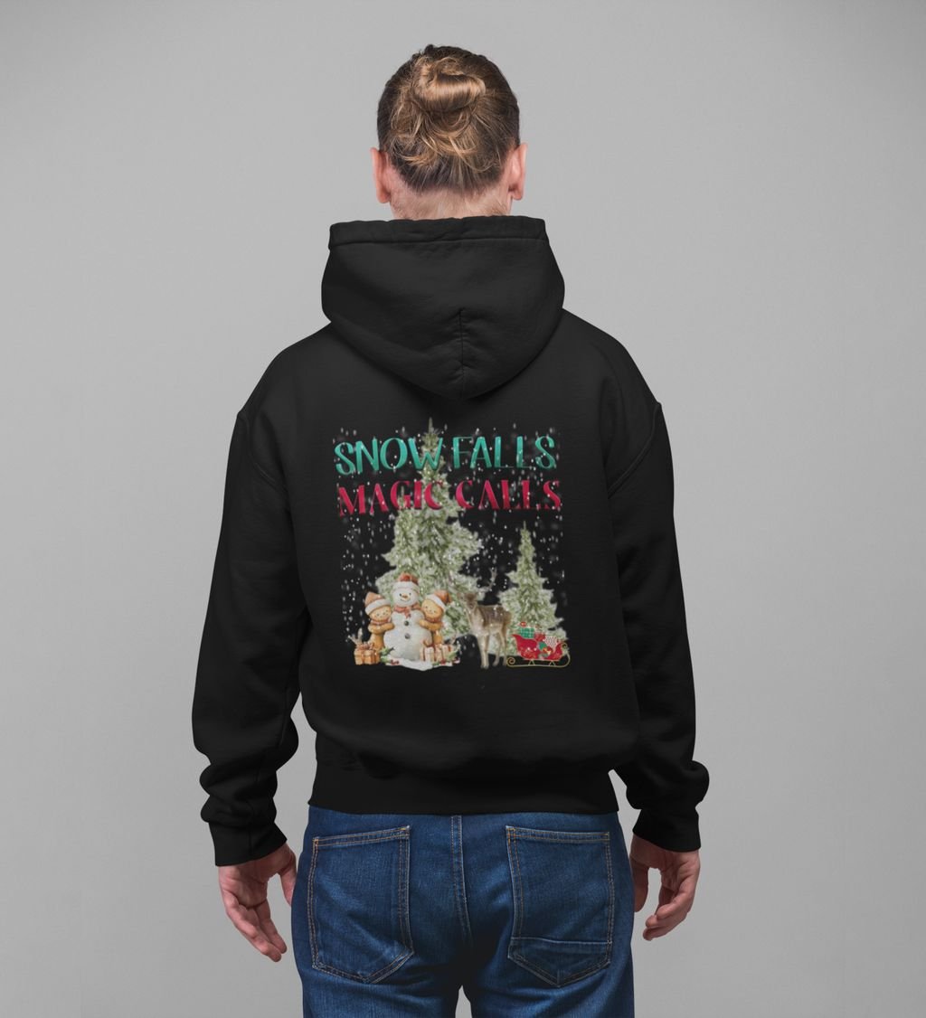 Charming Snowmen and Deer Enjoying the Magical Snowfall Printed Black Cotton Hoodie