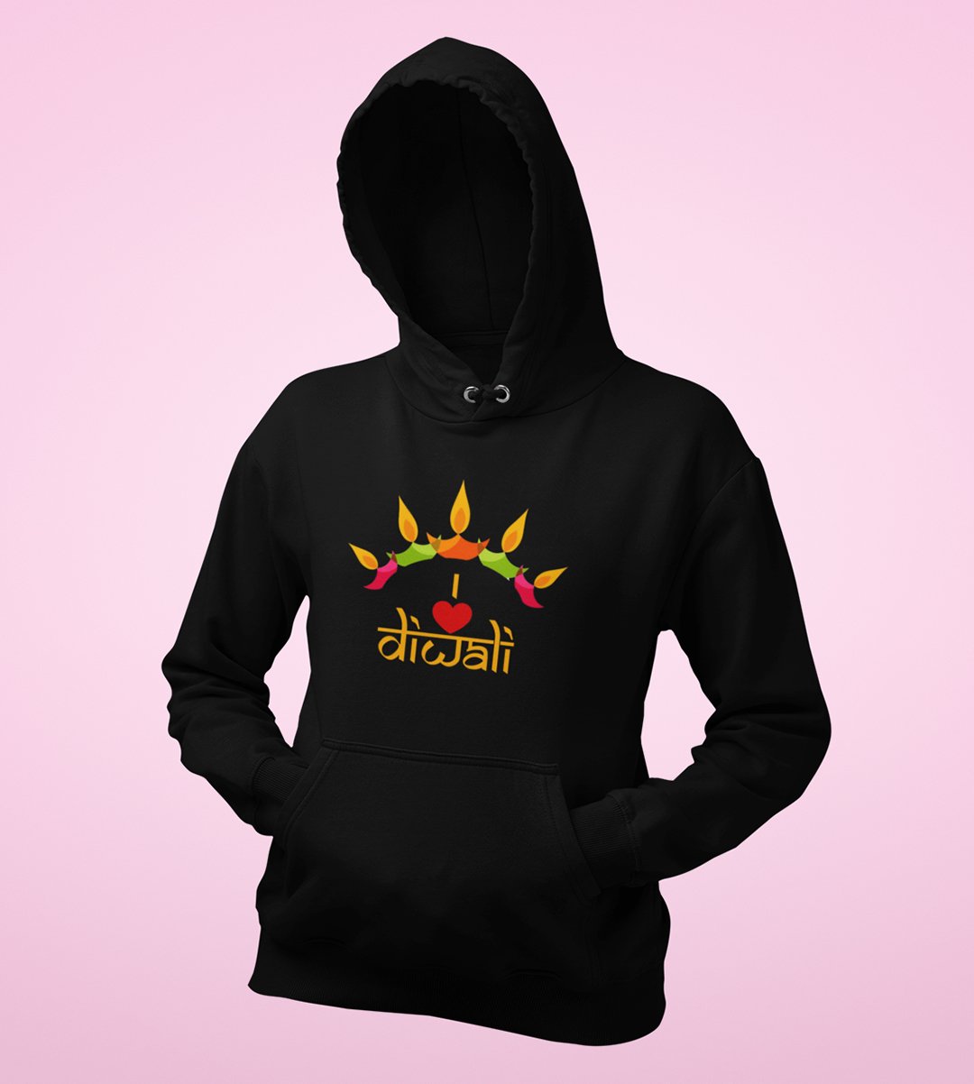 Classic earthen lamp /diyas vertically bended printed diwali themed black Hoodie specially for diwali festival