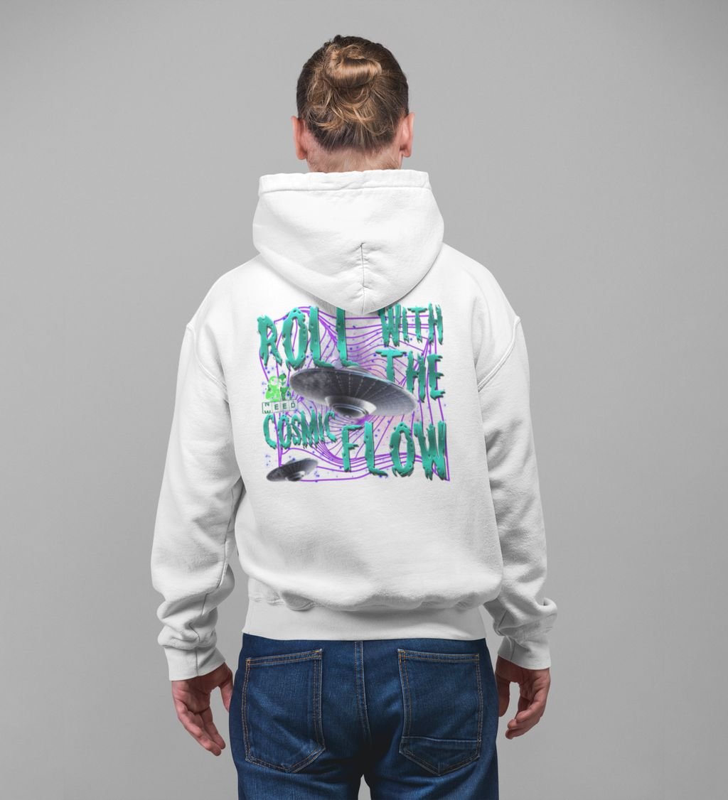 Cosmic Adventure Space Ship Roll with Cosmic Flow White Cotton Printed Hoodies For Men