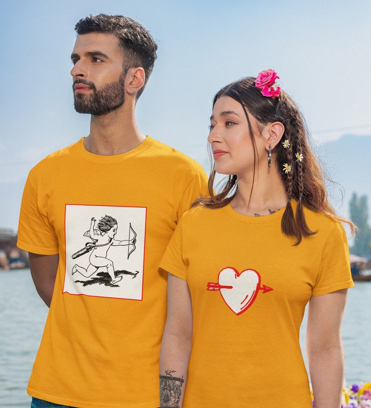 Cupid Hitting Arrow, Printed (Yellow) T-shirts For Couples