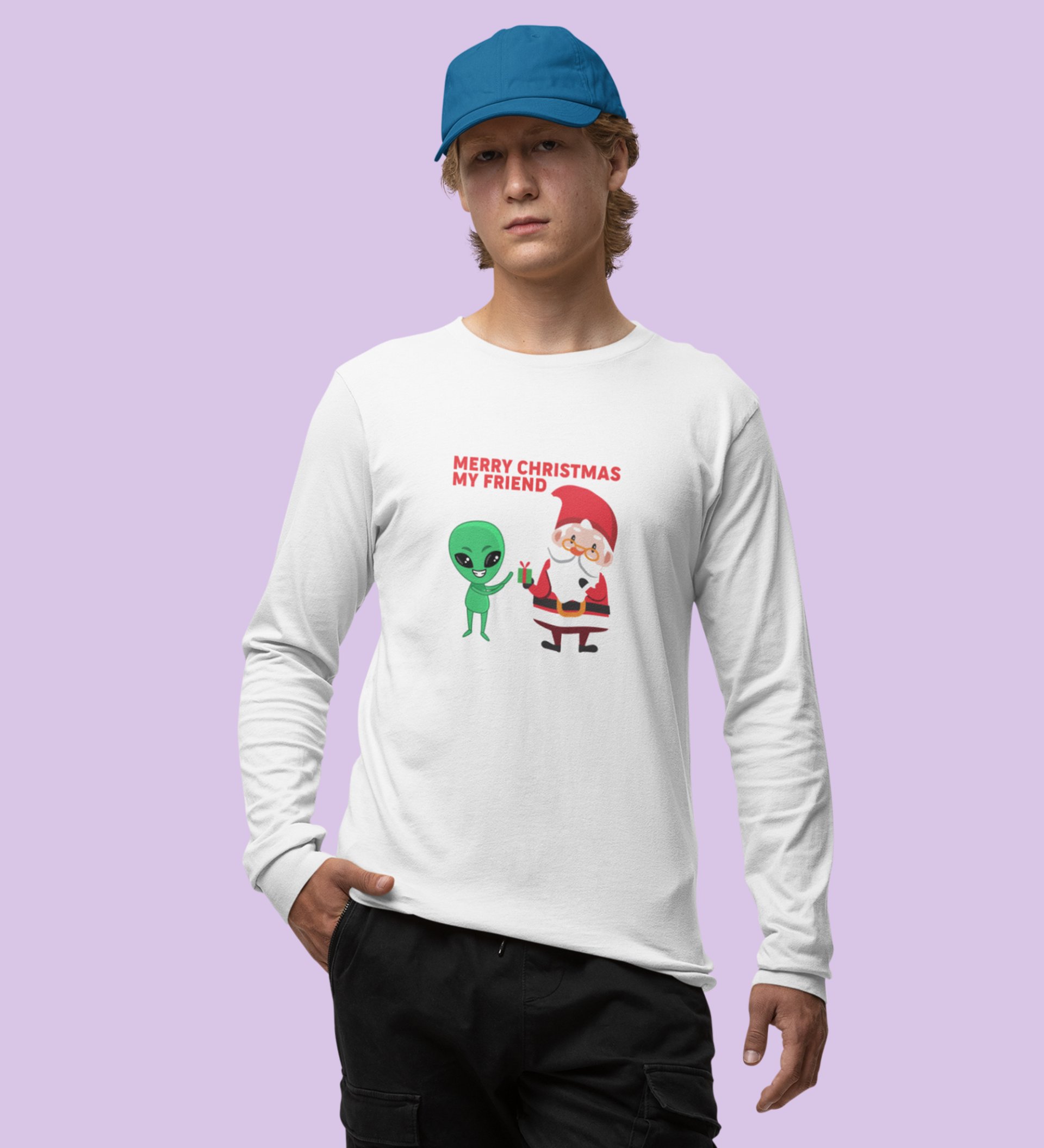Cute Santa With Alien: Cutest DesignedFull Sleeve T-shirt White Best Gift For Kids