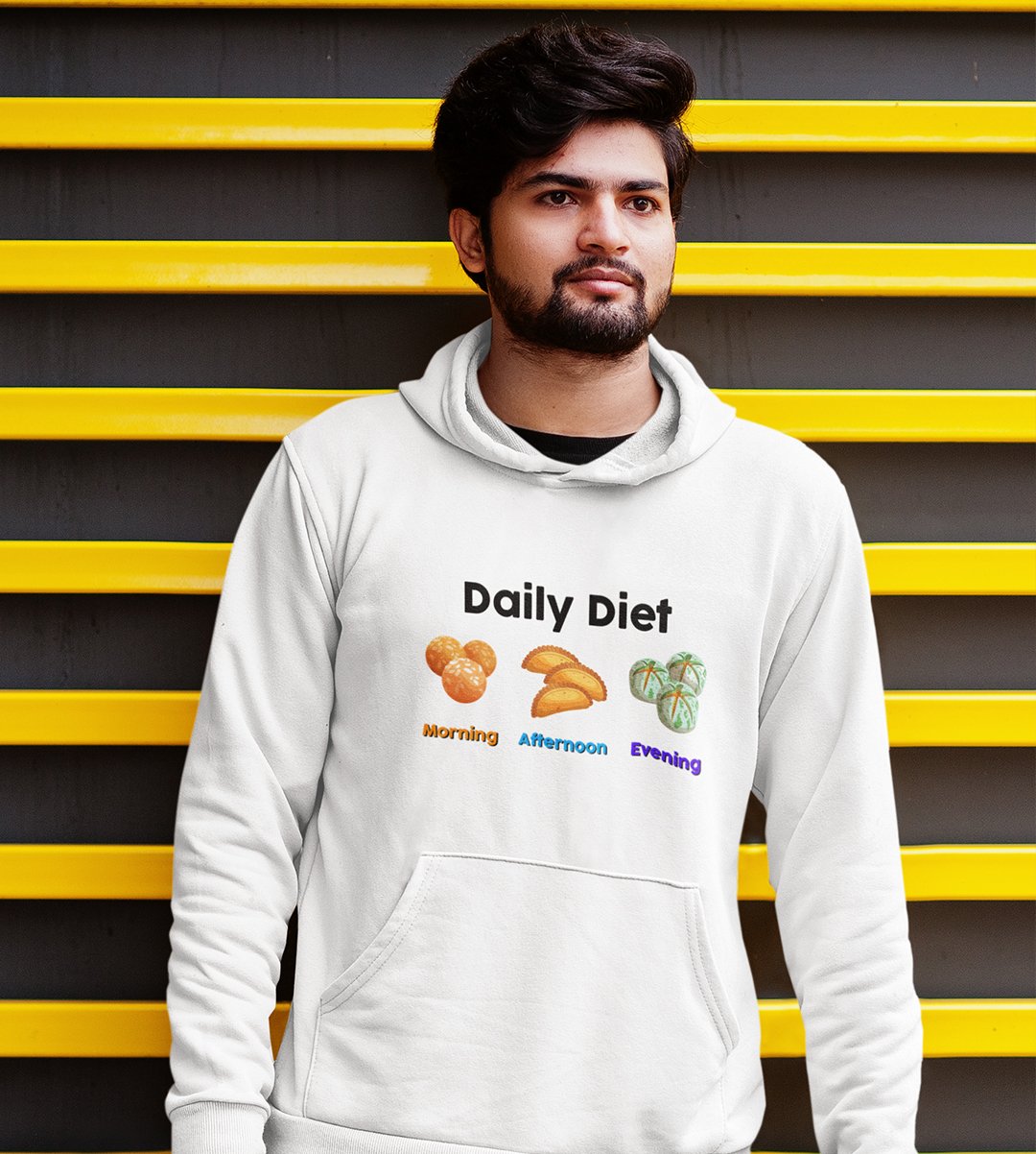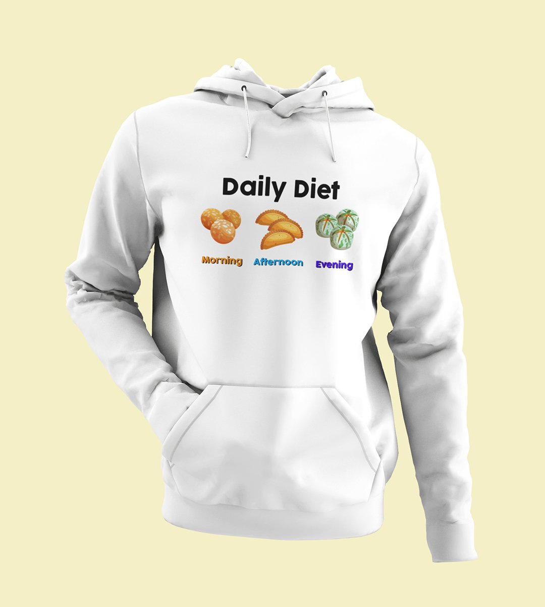 Indulge in the sweetest daily routine with our "Diwali Sweet Lover's Daily Diet" White Hoodie . This hilarious design showcases the typical daily schedule of a sweet tooth, complete with morning, afternoon, and evening sweets. It's a delightful reminder that every hour is a good time for dessert. Enjoy your favorite beverages with a touch of humor and sweetness during the festival of lights.