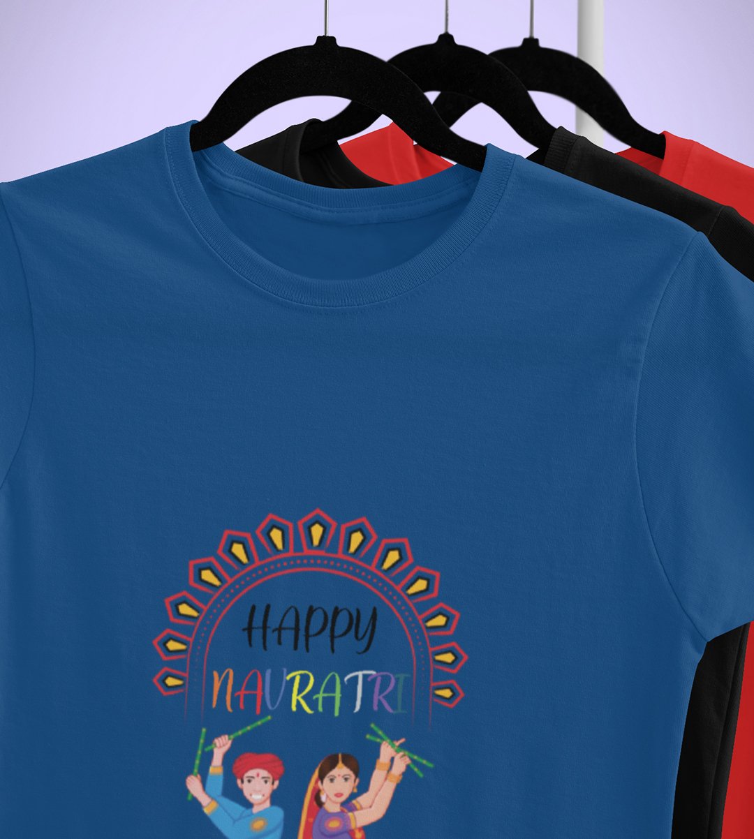 Navratri is a very auspicious festival for hindus. It takes place at the beginning of October and sometimes September. Enjoy the 9 days of festivities with full zeal and make yourself submerged in the love of Maa Durga. Navratri is also known as Durga Puja. And with this Tees, you can shine like a star during this festive season with our navratri themed cotton half sleeved Tshirts. You can pair our t-shirts with trousers and denim of your choice and make it a weekday smart casual or weekend wear. This is durable. This tshirt is smooth and soft which makes you comfortable to wear during all seasons. The printing in it is durable and odourless. It has five sizes, S,M,L,XL,XXL. The Tshirt colour is intact even after repeated washes. It can be kept in your wardrobe and hangers. Please avoid washing mashine to clean this Tee, it may affect the print. Hand wash only. We have brought you many navratri related designs printed on our different colour Tshirts to choose from. Grab it now.
