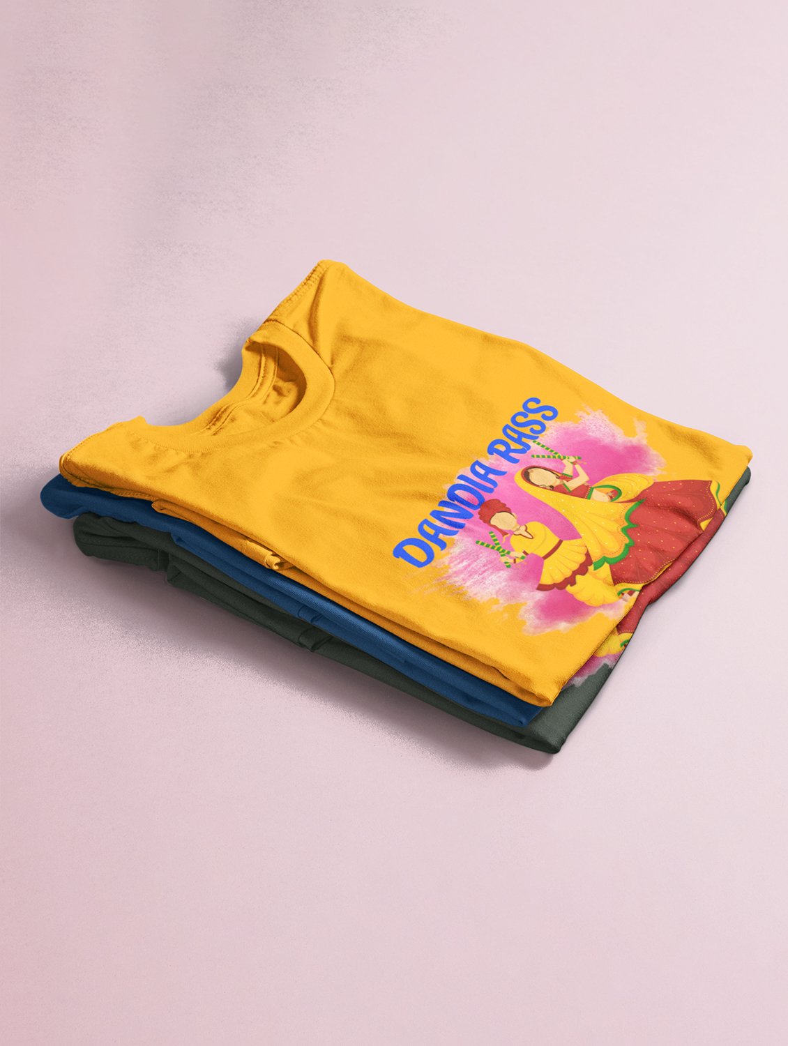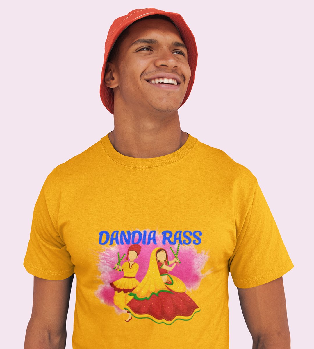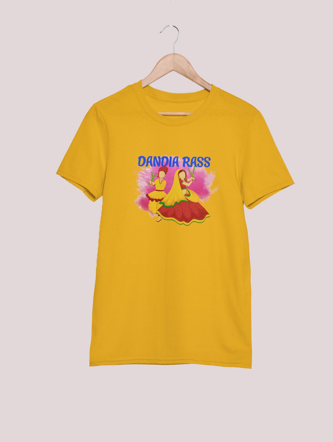 Dandiya rass printed unisex adults round neck cotton half-sleeve yellow tshirt specially for Navratri festival/ Durga puja