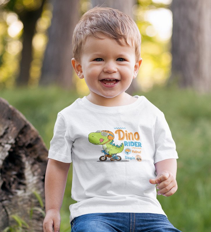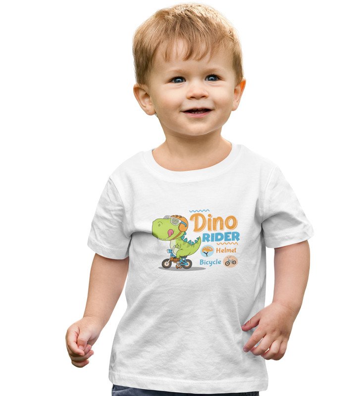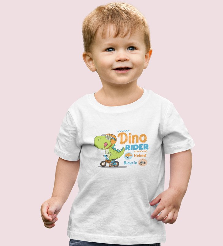 Dino Rider, Boys Round Neck Printed Blended Cotton Tshirt (White)