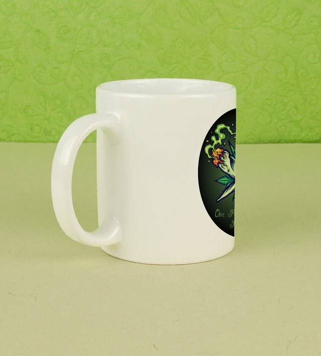 Start your day with a burst of vibrant energy! This printed coffee mug features a psychedelic leaf artwork surrounded by colorful flame-like patterns