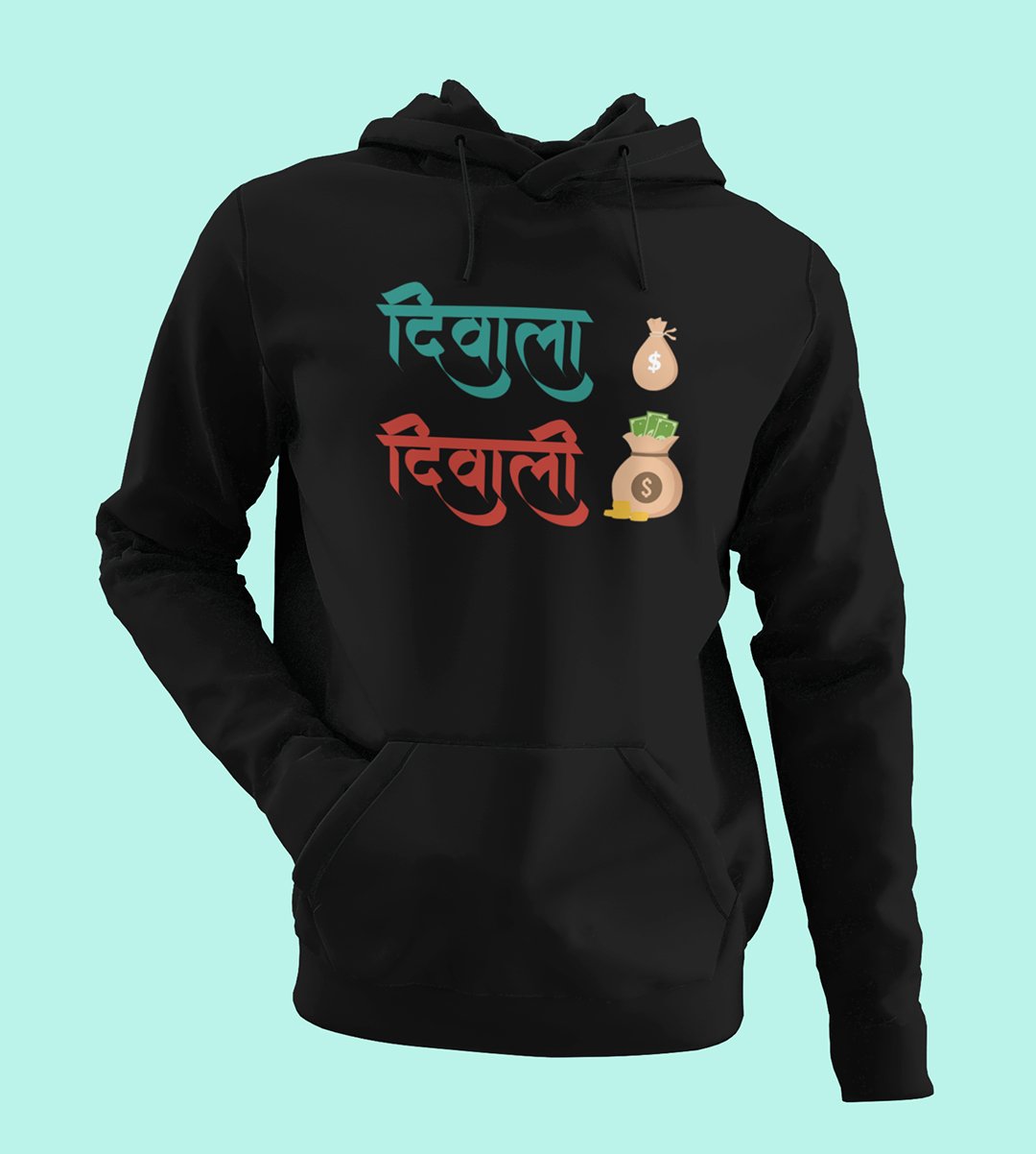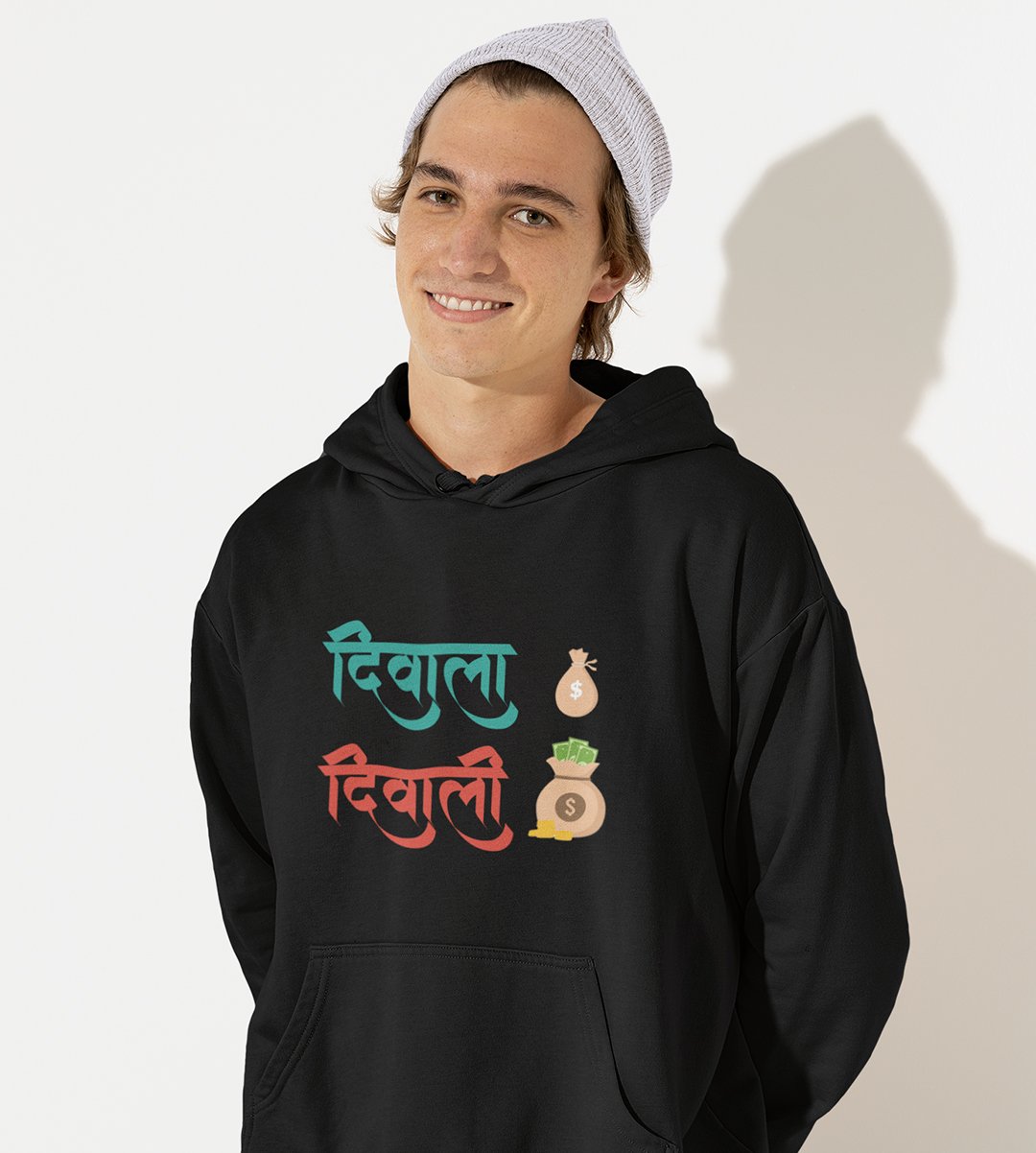 Celebrate the journey from "Divala" to "Diwali" with our black Hoodie . This unique design in Hindi font showcases the transformation of fortunes, from times of no money to the abundance of Diwali. Sip your and reflect on the cycles of wealth and prosperity that define the festival.