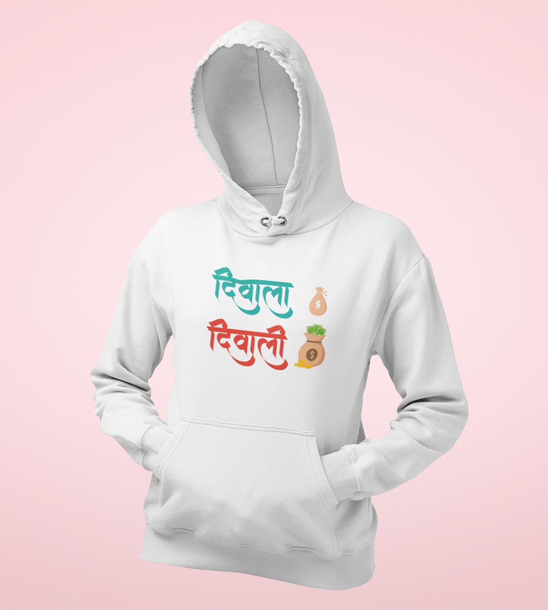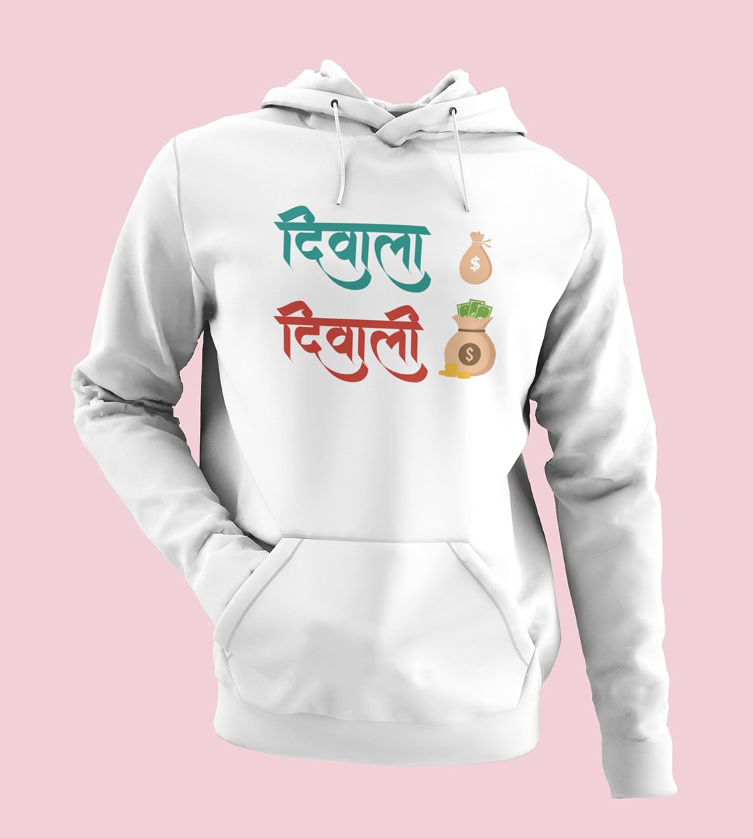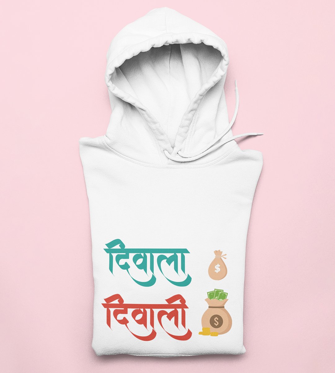 Celebrate the journey from "Divala" to "Diwali" with our White Hoodie . This unique design in Hindi font showcases the transformation of fortunes, from times of no money to the abundance of Diwali. Sip your and reflect on the cycles of wealth and prosperity that define the festival.