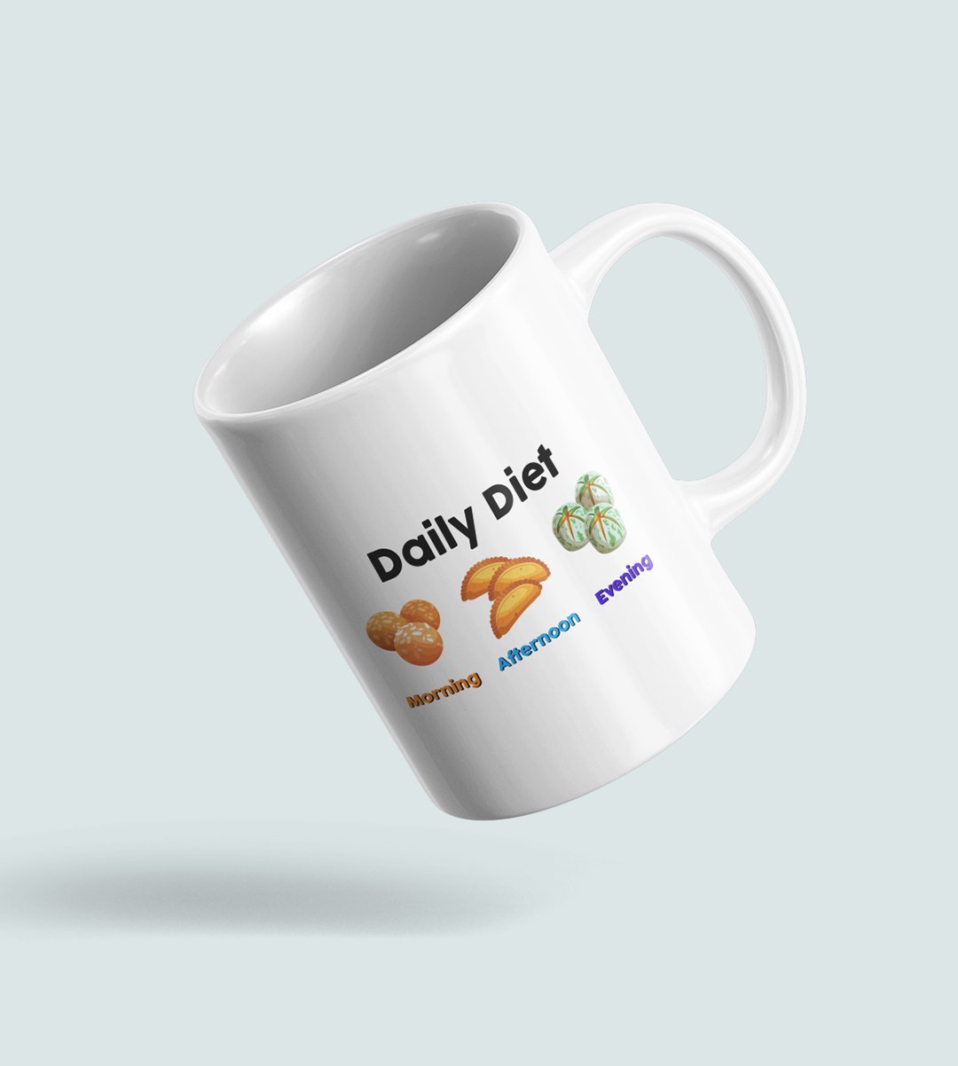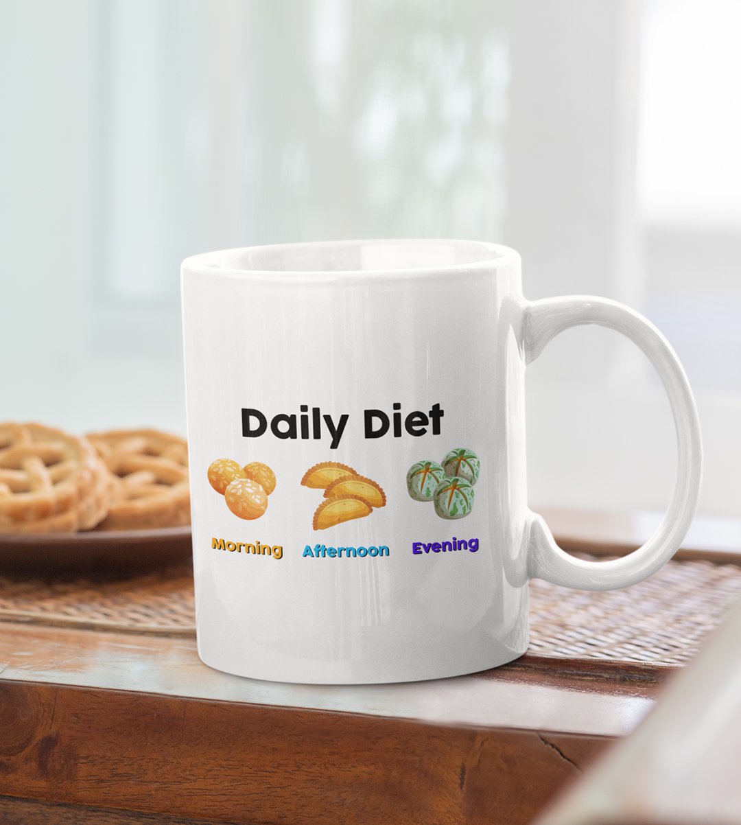 Indulge in the sweetest daily routine with our "Diwali Sweet Lover's Daily Diet" Coffee Mug. This hilarious design showcases the typical daily schedule of a sweet tooth, complete with morning, afternoon, and evening sweets. It's a delightful reminder that every hour is a good time for dessert. Enjoy your favorite beverages with a touch of humor and sweetness during the festival of lights.