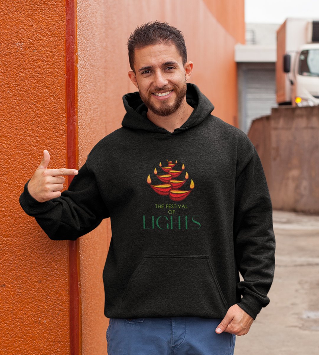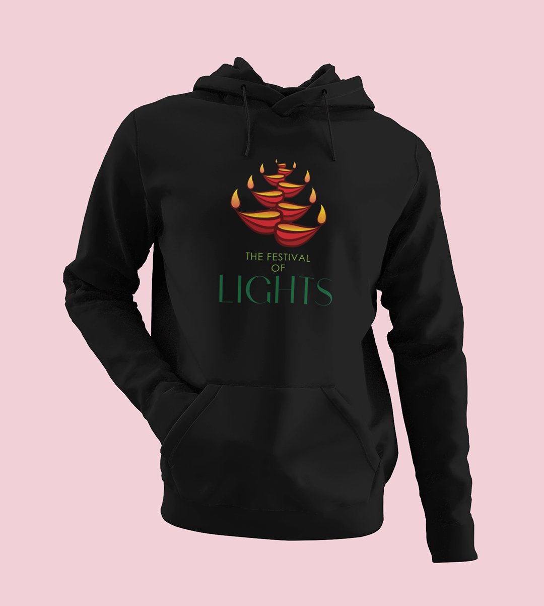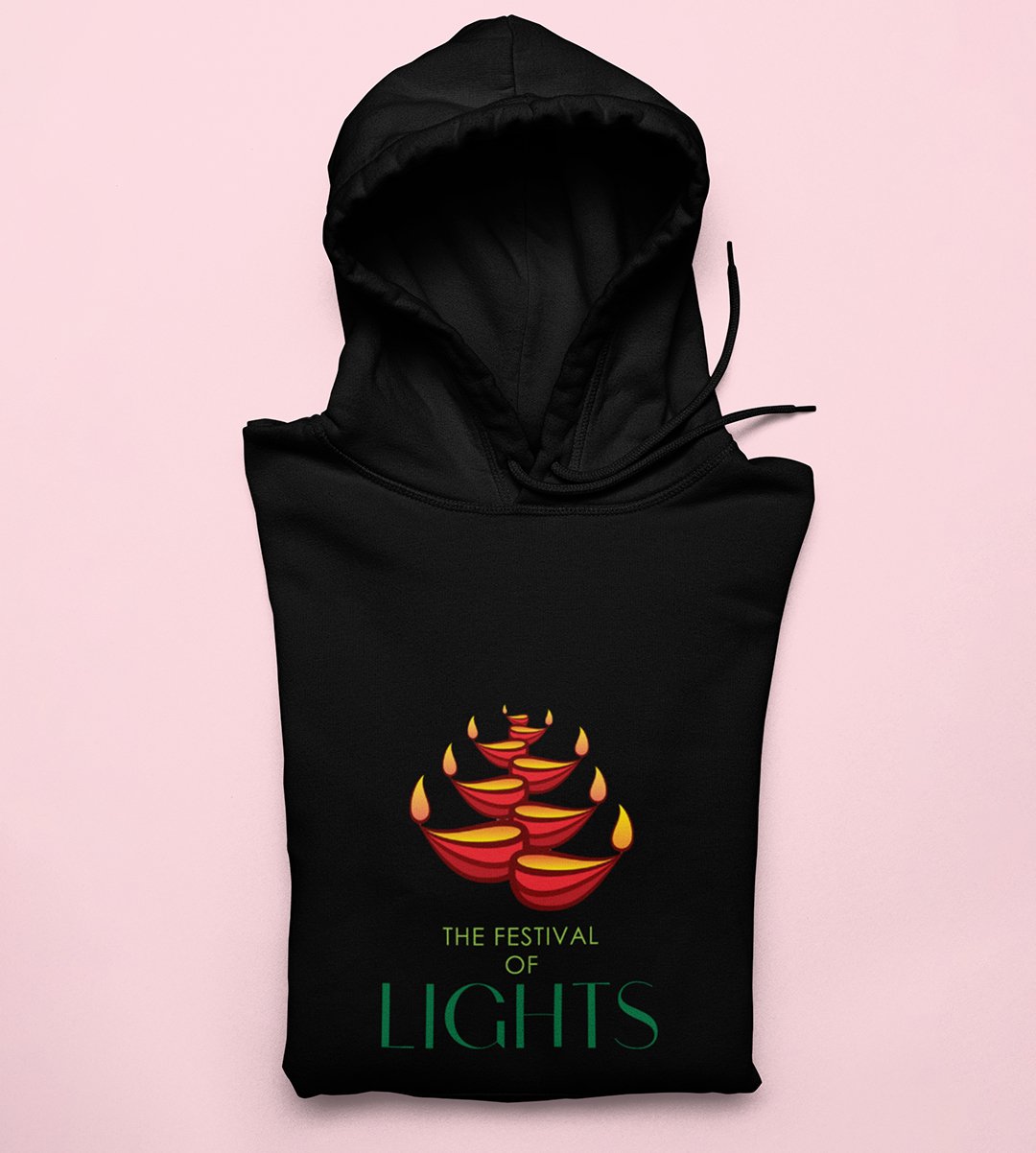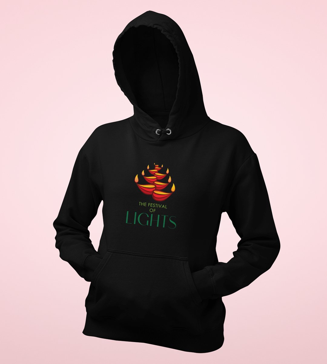 Illuminate your Diwali celebrations with our "Festival of Lights" Diya black Hoodie . The radiant diya images evoke the spirit of the festival, spreading warmth and joy. Enjoy your festive beverages in the company of Diwali's brilliance.