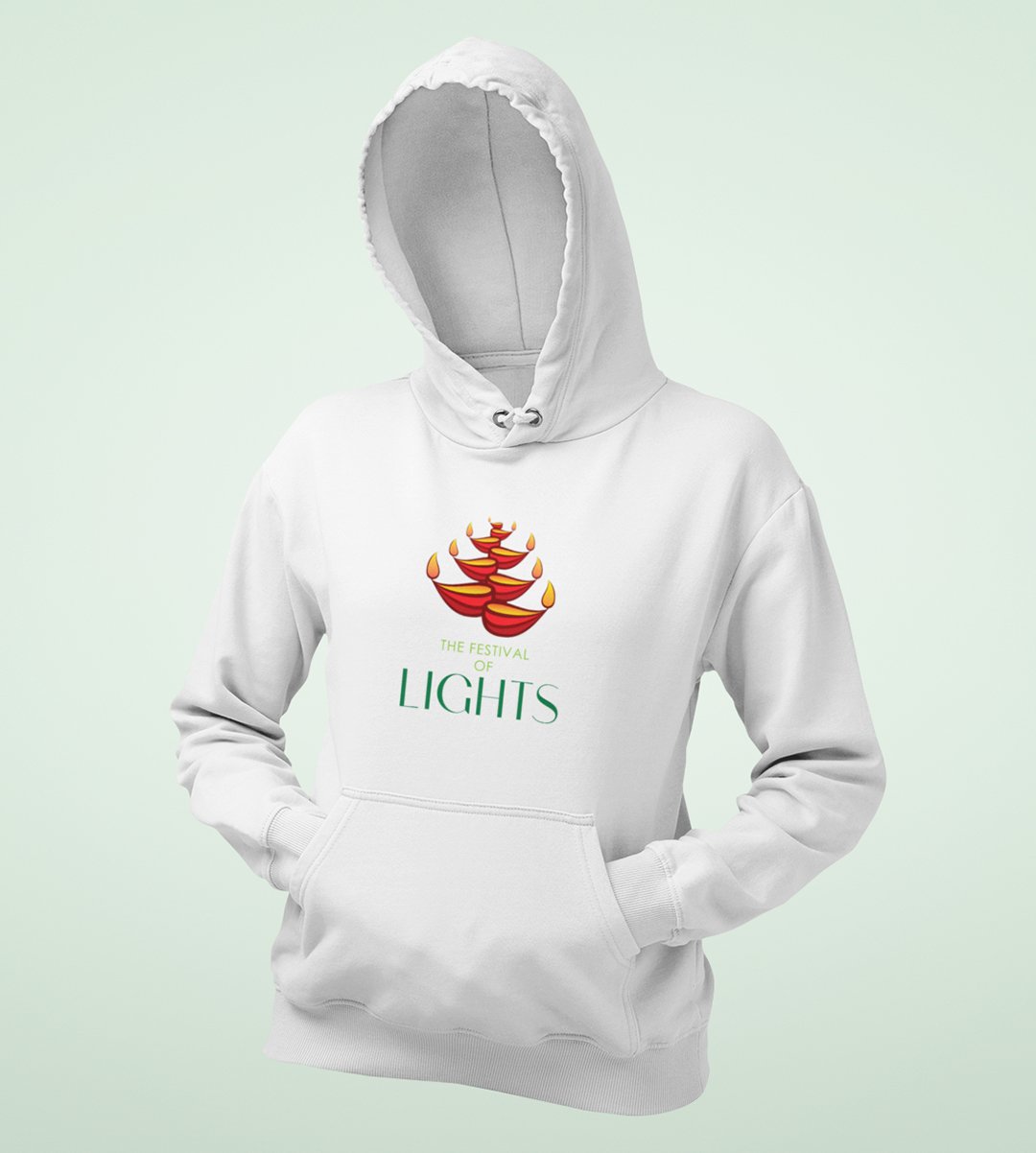 Illuminate your Diwali celebrations with our "Festival of Lights" Diya White Hoodie . The radiant diya images evoke the spirit of the festival, spreading warmth and joy. Enjoy your festive beverages in the company of Diwali's brilliance.