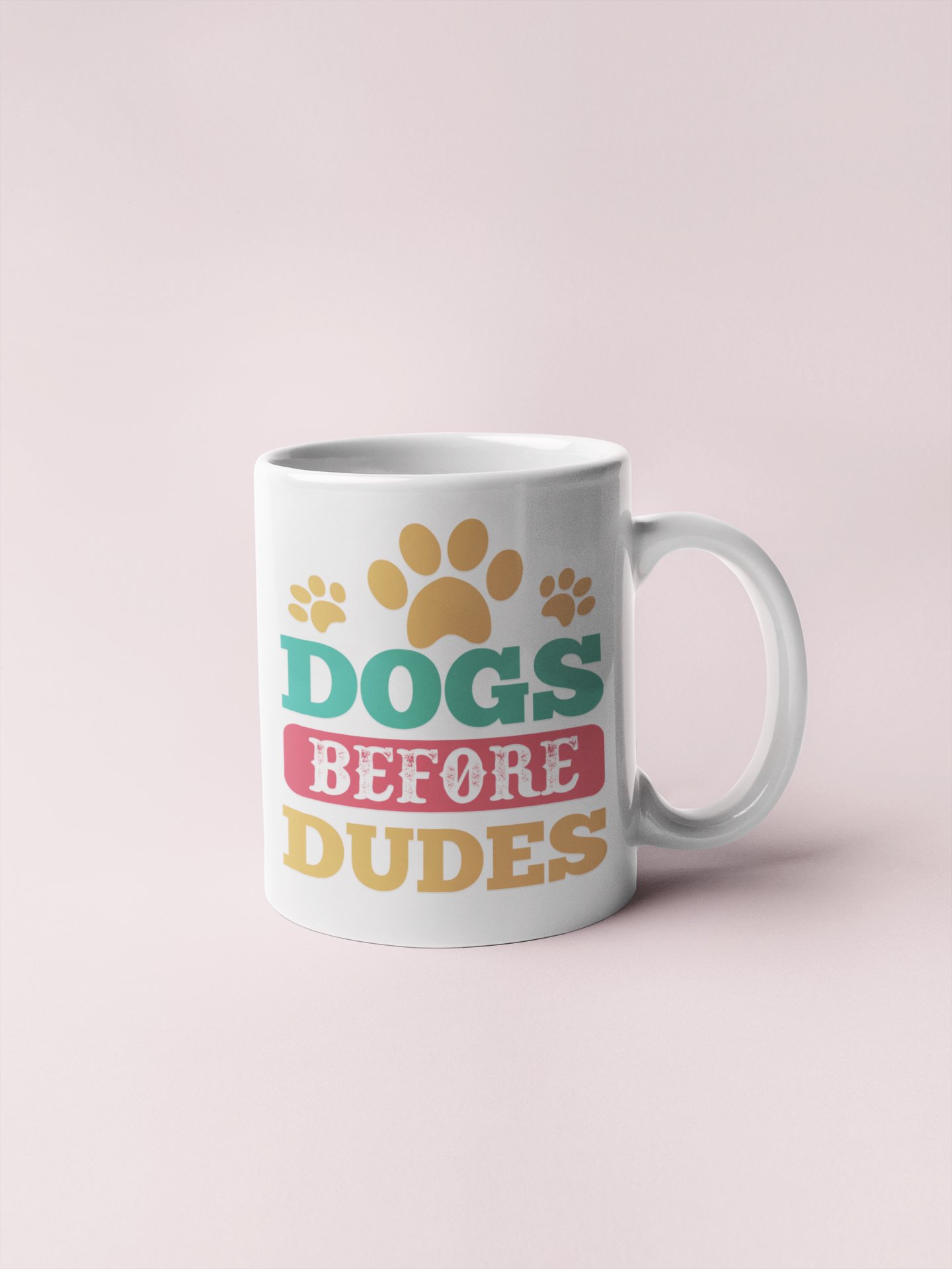 Dogs before dudes - pets themed printed ceramic white coffee and tea mugs/ cups for pets lover people