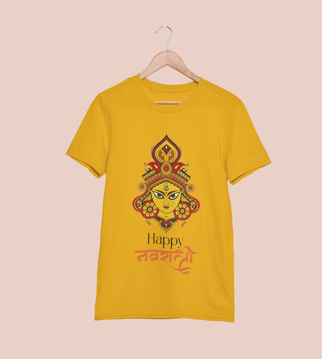 Navratri is a very auspicious festival for hindus. It takes place at the beginning of October and sometimes September. Enjoy the 9 days of festivities with full zeal and make yourself submerged in the love of Maa Durga. Navratri is also known as Durga Puja. And with this Tees, you can shine like a star during this festive season with our navratri themed cotton half sleeved Tshirts. You can pair our t-shirts with trousers and denim of your choice and make it a weekday smart casual or weekend wear. This is durable. This tshirt is smooth and soft which makes you comfortable to wear during all seasons. The printing in it is durable and odourless. It has five sizes, S,M,L,XL,XXL. The Tshirt colour is intact even after repeated washes. It can be kept in your wardrobe and hangers. Please avoid washing mashine to clean this Tee, it may affect the print. Hand wash only. We have brought you many navratri related designs printed on our different colour Tshirts to choose from. Grab it now.