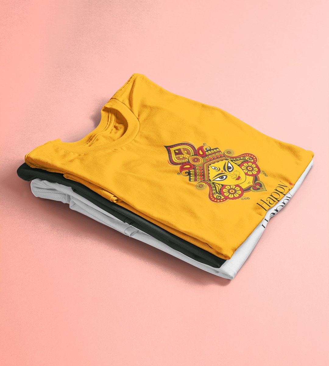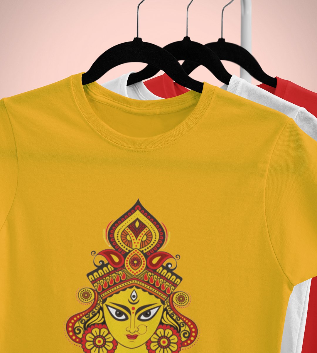 Durga ma face printed unisex adults round neck cotton half-sleeve yellow tshirt specially for Navratri festival/ Durga puja