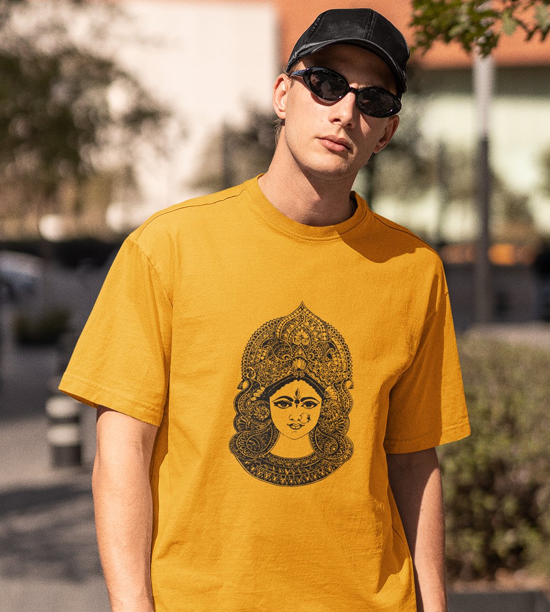 Durga maa black potrait printed unisex adults round neck cotton half-sleeve yellow tshirt specially for Navratri festival/ Durga puja