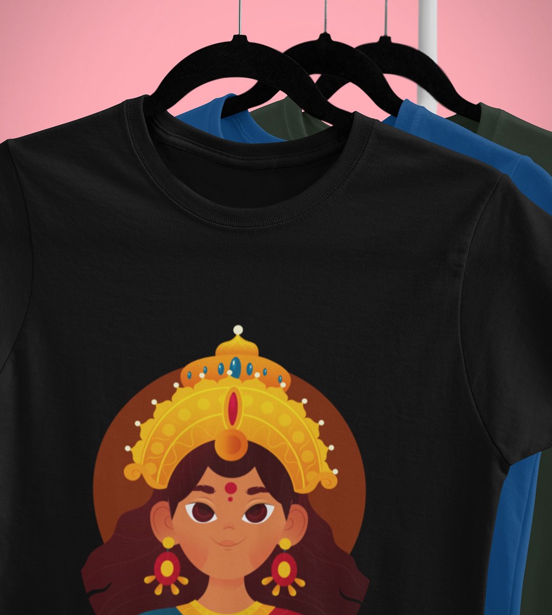 Navratri is a very auspicious festival for hindus. It takes place at the beginning of October and sometimes September. Enjoy the 9 days of festivities with full zeal and make yourself submerged in the love of Maa Durga. Navratri is also known as Durga Puja. And with this Tees, you can shine like a star during this festive season with our navratri themed cotton half sleeved Tshirts. You can pair our t-shirts with trousers and denim of your choice and make it a weekday smart casual or weekend wear. This is durable. This tshirt is smooth and soft which makes you comfortable to wear during all seasons. The printing in it is durable and odourless. It has five sizes, S,M,L,XL,XXL. The Tshirt colour is intact even after repeated washes. It can be kept in your wardrobe and hangers. Please avoid washing mashine to clean this Tee, it may affect the print. Hand wash only. We have brought you many navratri related designs printed on our different colour Tshirts to choose from. Grab it now.