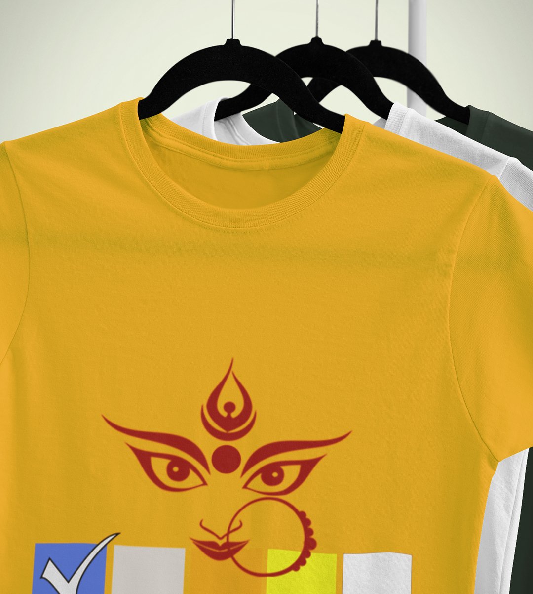 Navratri is a very auspicious festival for hindus. It takes place at the beginning of October and sometimes September. Enjoy the 9 days of festivities with full zeal and make yourself submerged in the love of Maa Durga. Navratri is also known as Durga Puja. And with this Tees, you can shine like a star during this festive season with our navratri themed cotton half sleeved Tshirts. You can pair our t-shirts with trousers and denim of your choice and make it a weekday smart casual or weekend wear. This is durable. This tshirt is smooth and soft which makes you comfortable to wear during all seasons. The printing in it is durable and odourless. It has five sizes, S,M,L,XL,XXL. The Tshirt colour is intact even after repeated washes. It can be kept in your wardrobe and hangers. Please avoid washing mashine to clean this Tee, it may affect the print. Hand wash only. We have brought you many navratri related designs printed on our different colour Tshirts to choose from. Grab it now.