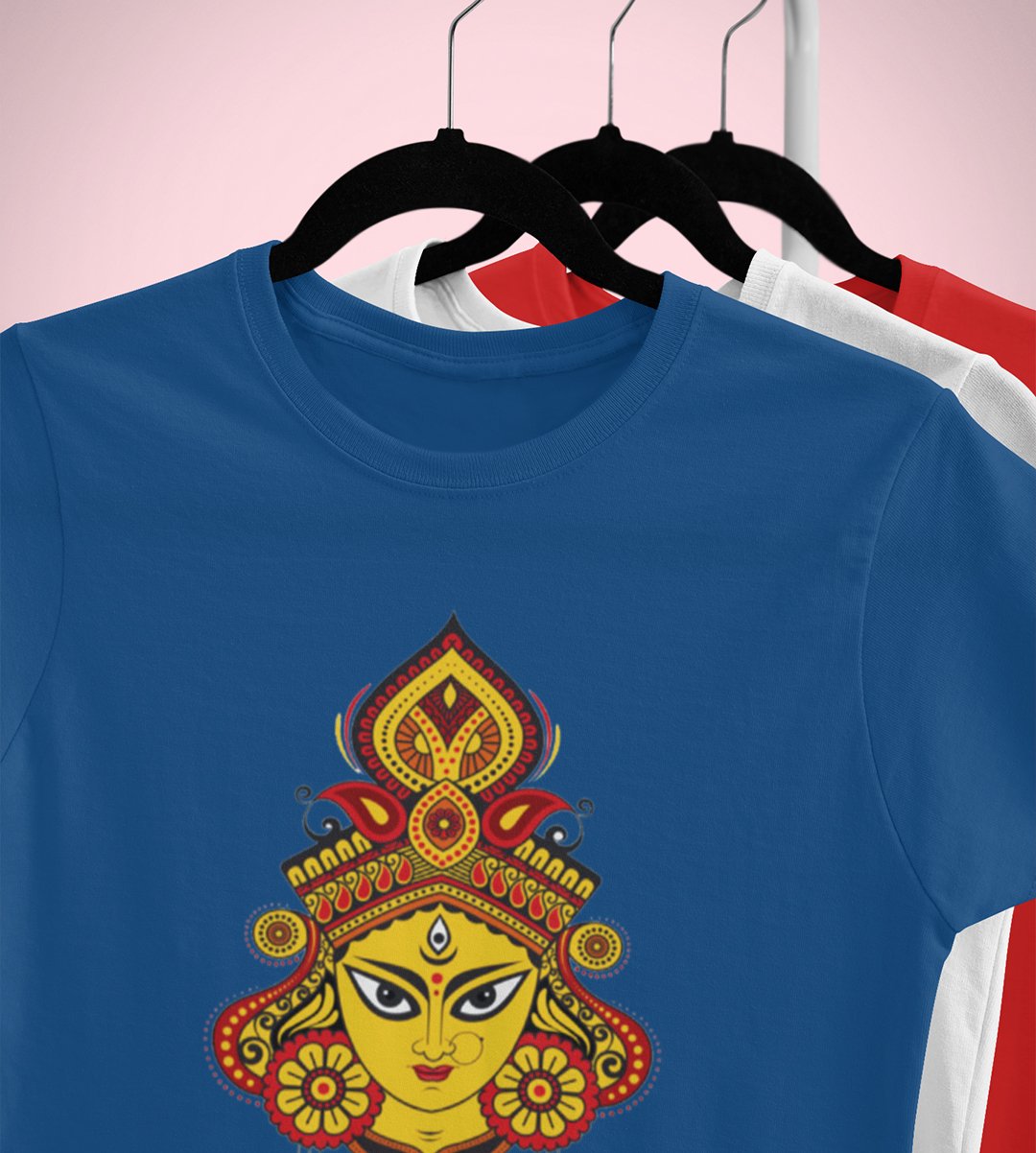 Durga maa face (Yellow) printed unisex adults round neck cotton half-sleeve blue tshirt specially for Navratri festival/ Durga puja