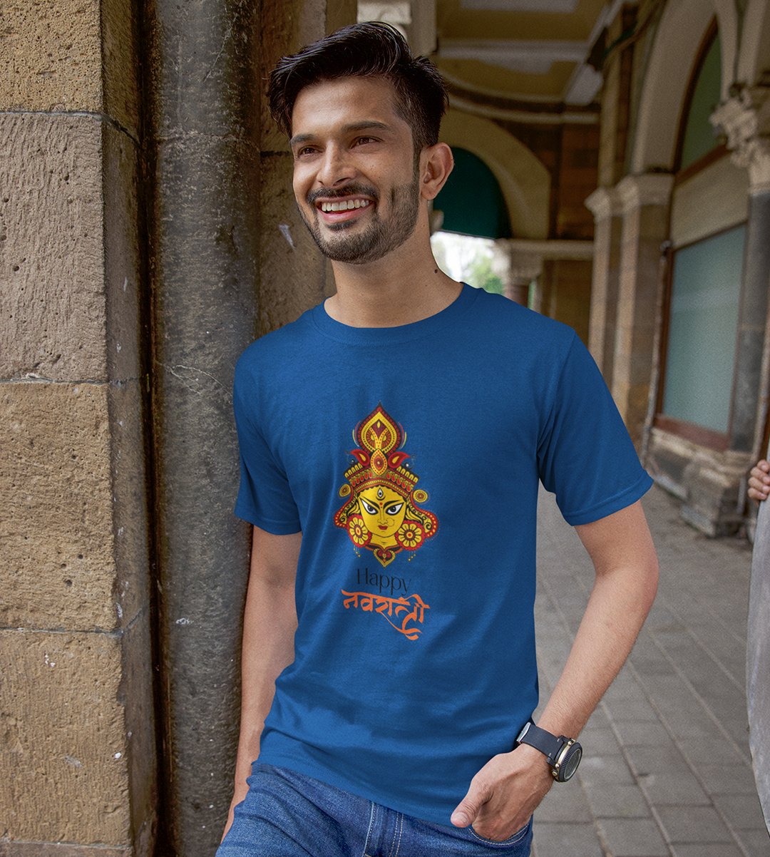 Navratri is a very auspicious festival for hindus. It takes place at the beginning of October and sometimes September. Enjoy the 9 days of festivities with full zeal and make yourself submerged in the love of Maa Durga. Navratri is also known as Durga Puja. And with this Tees, you can shine like a star during this festive season with our navratri themed cotton half sleeved Tshirts. You can pair our t-shirts with trousers and denim of your choice and make it a weekday smart casual or weekend wear. This is durable. This tshirt is smooth and soft which makes you comfortable to wear during all seasons. The printing in it is durable and odourless. It has five sizes, S,M,L,XL,XXL. The Tshirt colour is intact even after repeated washes. It can be kept in your wardrobe and hangers. Please avoid washing mashine to clean this Tee, it may affect the print. Hand wash only. We have brought you many navratri related designs printed on our different colour Tshirts to choose from. Grab it now.