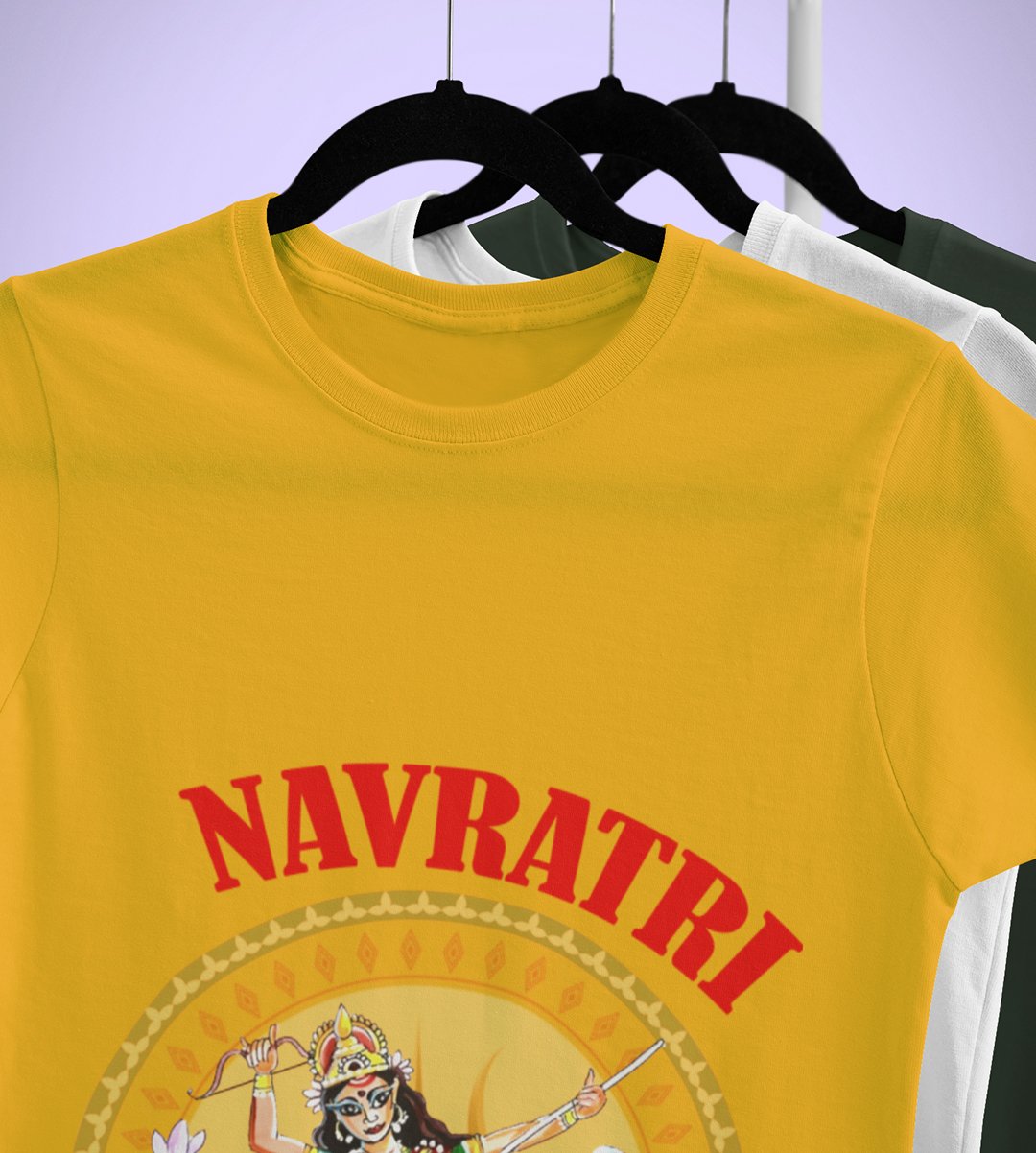 Navratri is a very auspicious festival for hindus. It takes place at the beginning of October and sometimes September. Enjoy the 9 days of festivities with full zeal and make yourself submerged in the love of Maa Durga. Navratri is also known as Durga Puja. And with this Tees, you can shine like a star during this festive season with our navratri themed cotton half sleeved Tshirts. You can pair our t-shirts with trousers and denim of your choice and make it a weekday smart casual or weekend wear. This is durable. This tshirt is smooth and soft which makes you comfortable to wear during all seasons. The printing in it is durable and odourless. It has five sizes, S,M,L,XL,XXL. The Tshirt colour is intact even after repeated washes. It can be kept in your wardrobe and hangers. Please avoid washing mashine to clean this Tee, it may affect the print. Hand wash only. We have brought you many navratri related designs printed on our different colour Tshirts to choose from. Grab it now.
