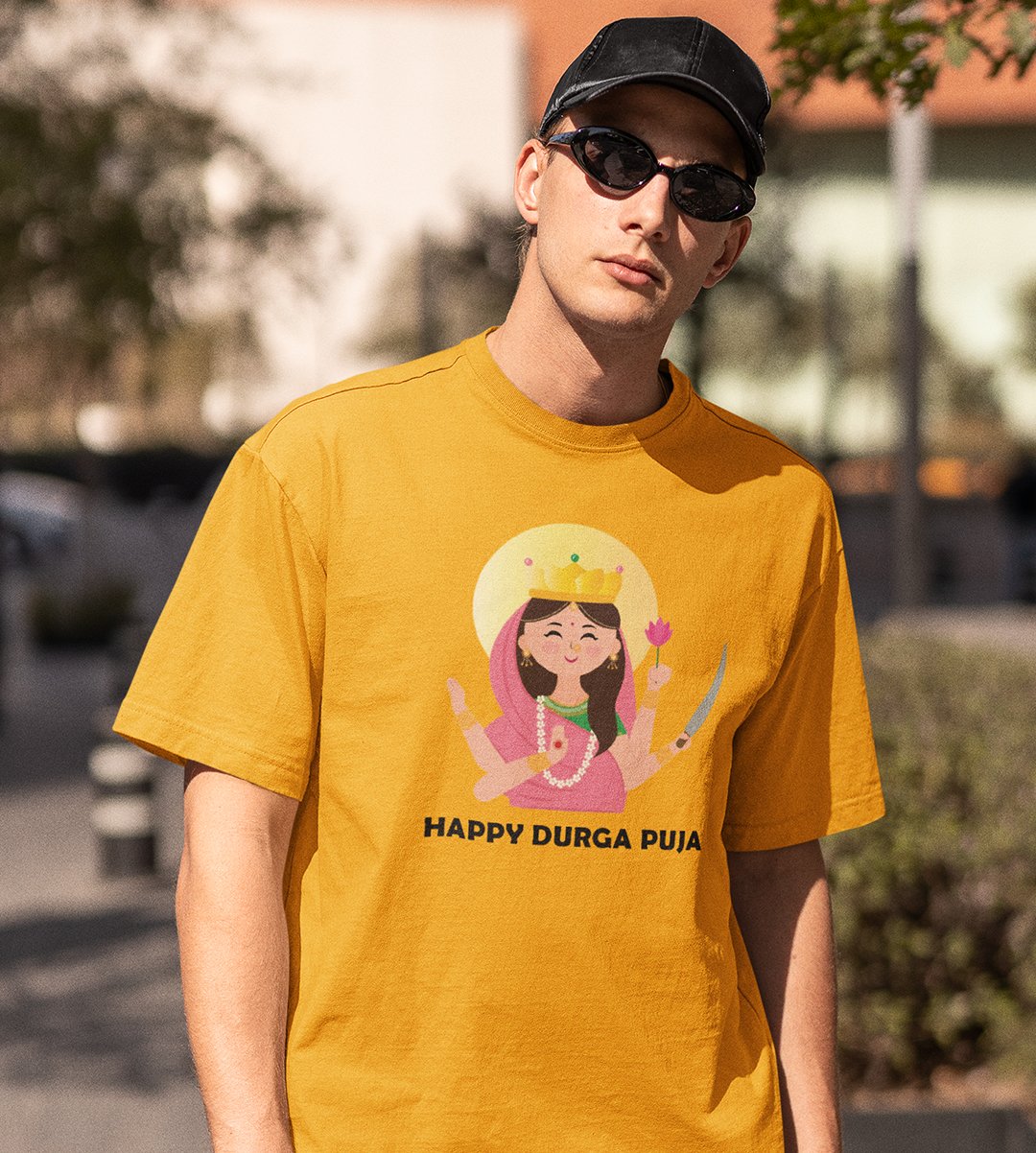 Navratri is a very auspicious festival for hindus. It takes place at the beginning of October and sometimes September. Enjoy the 9 days of festivities with full zeal and make yourself submerged in the love of Maa Durga. Navratri is also known as Durga Puja. And with this Tees, you can shine like a star during this festive season with our navratri themed cotton half sleeved Tshirts. You can pair our t-shirts with trousers and denim of your choice and make it a weekday smart casual or weekend wear. This is durable. This tshirt is smooth and soft which makes you comfortable to wear during all seasons. The printing in it is durable and odourless. It has five sizes, S,M,L,XL,XXL. The Tshirt colour is intact even after repeated washes. It can be kept in your wardrobe and hangers. Please avoid washing mashine to clean this Tee, it may affect the print. Hand wash only. We have brought you many navratri related designs printed on our different colour Tshirts to choose from. Grab it now.
