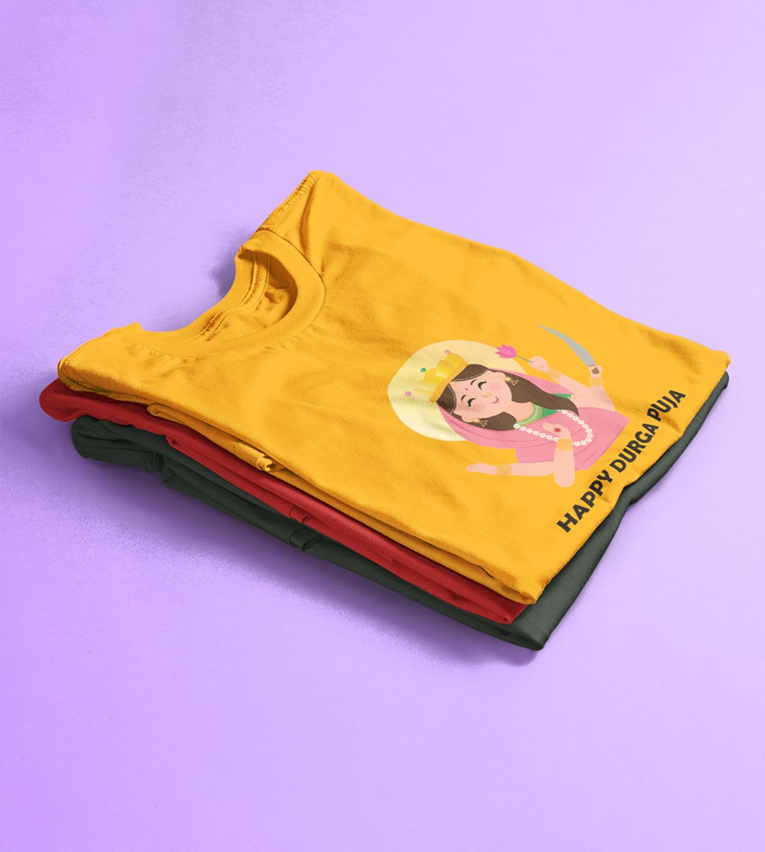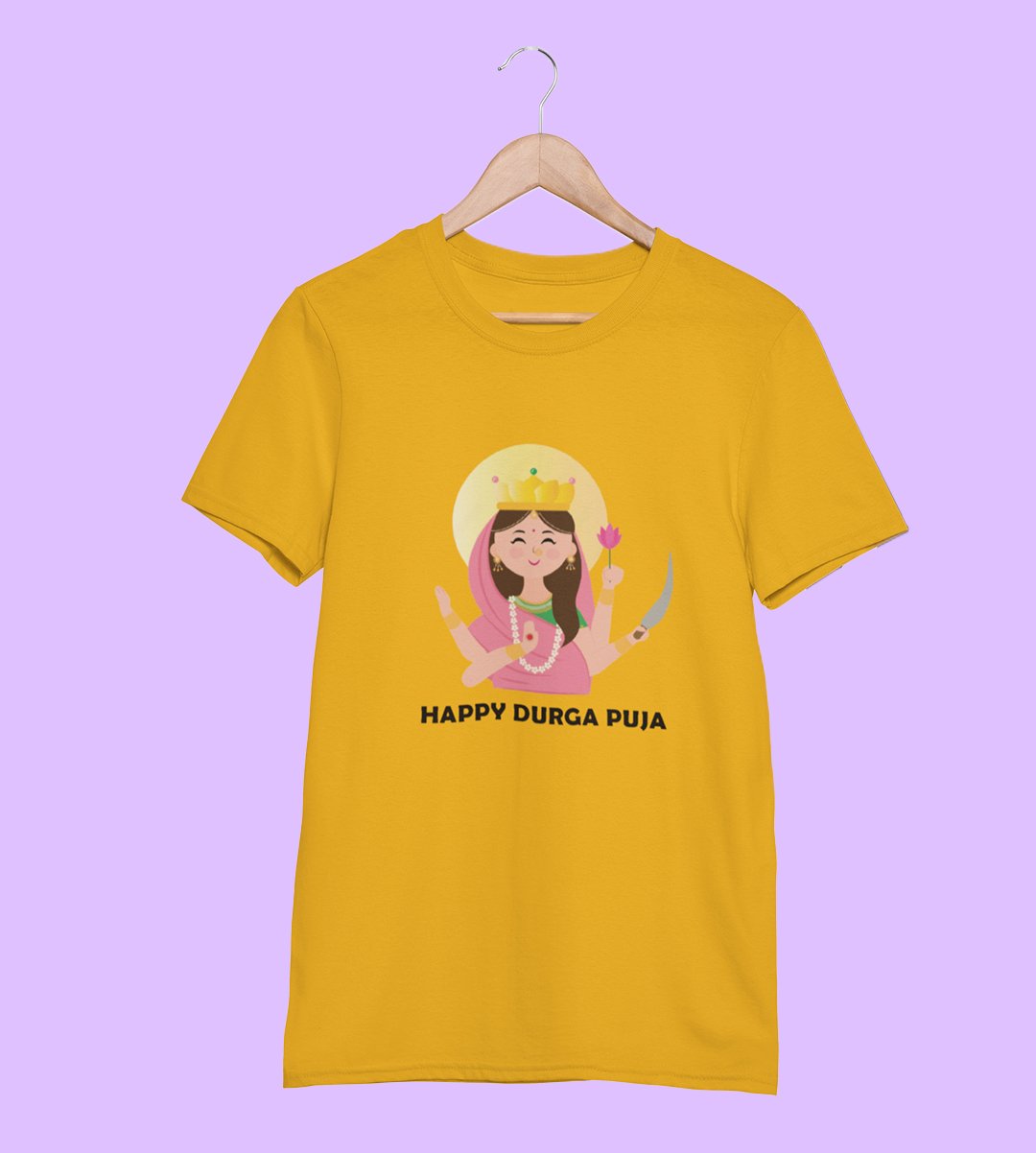 Durga maa (pink) printed unisex adults round neck cotton half-sleeve yellow tshirt specially for Navratri festival/ Durga puja