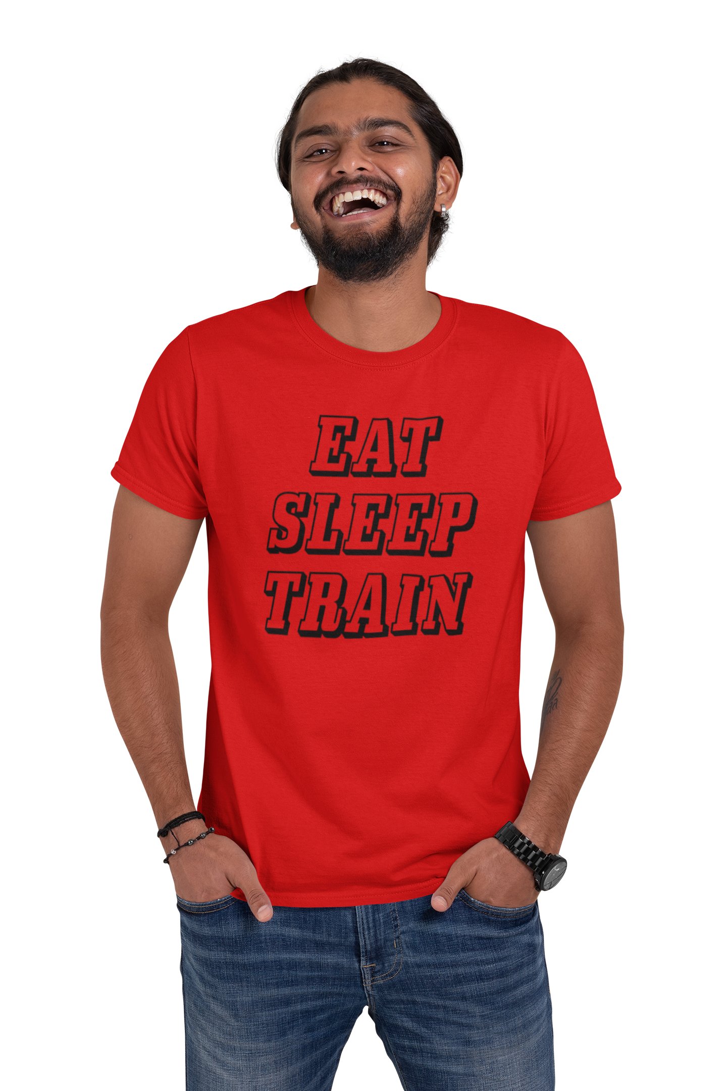 Eat, Sleep, Train, (BG Black), Round Neck Gym Tshirt (Red Tshirt) - Clothes for Gym Lovers - Foremost Gifting Material for Your Friends and Close Ones