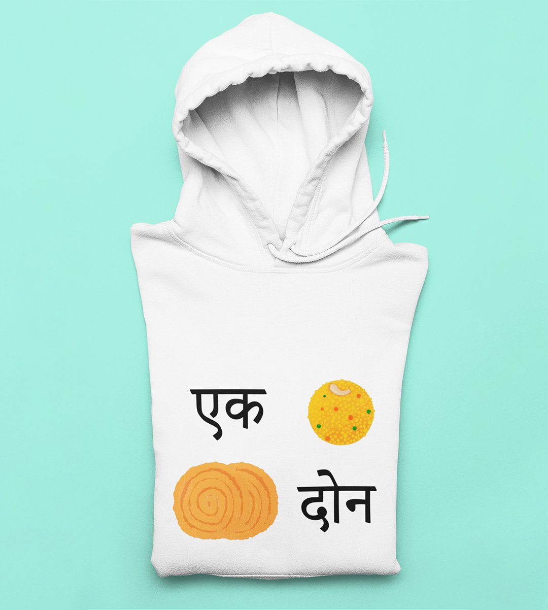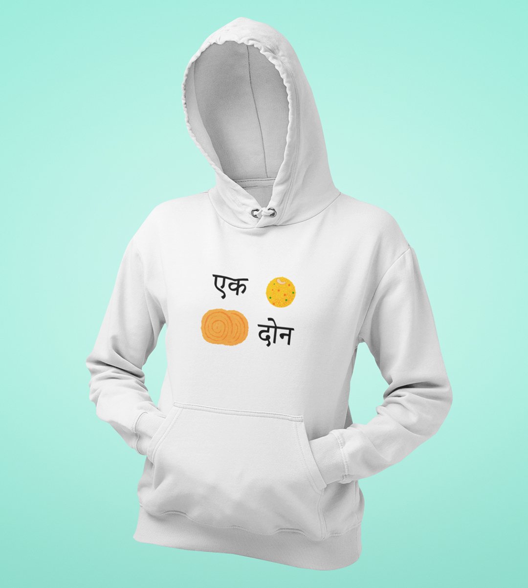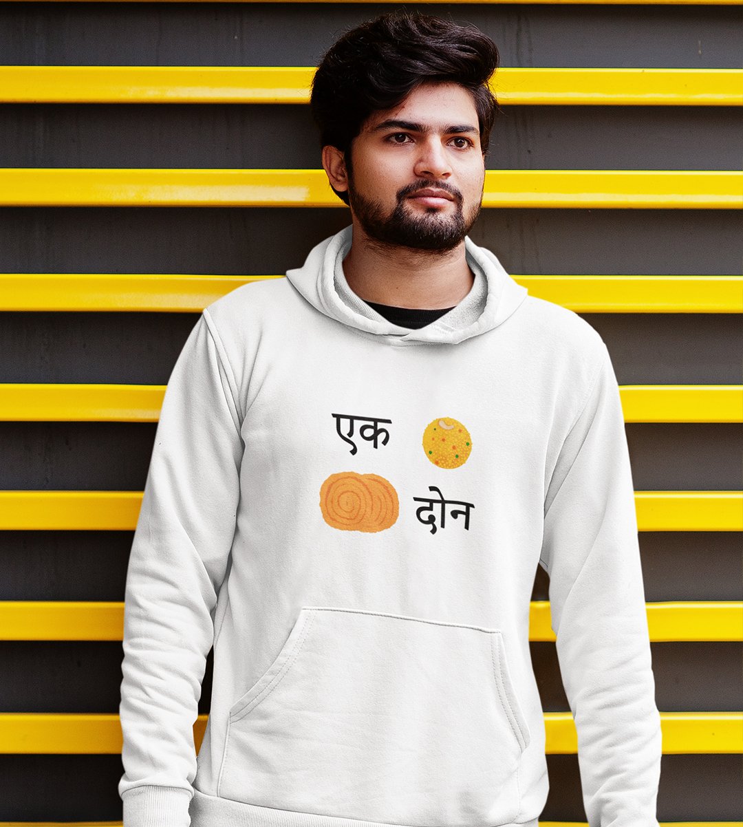 Celebrate the delectable delights of Diwali with our "Diwali Snack Delight" White Hoodie . This delightful design showcases the perfect combination of 1 Ladoo and 2 Chakli, a treat for your taste buds. Sip your and indulge in the joy of Diwali snacking with this mouthwatering White Hoodie .