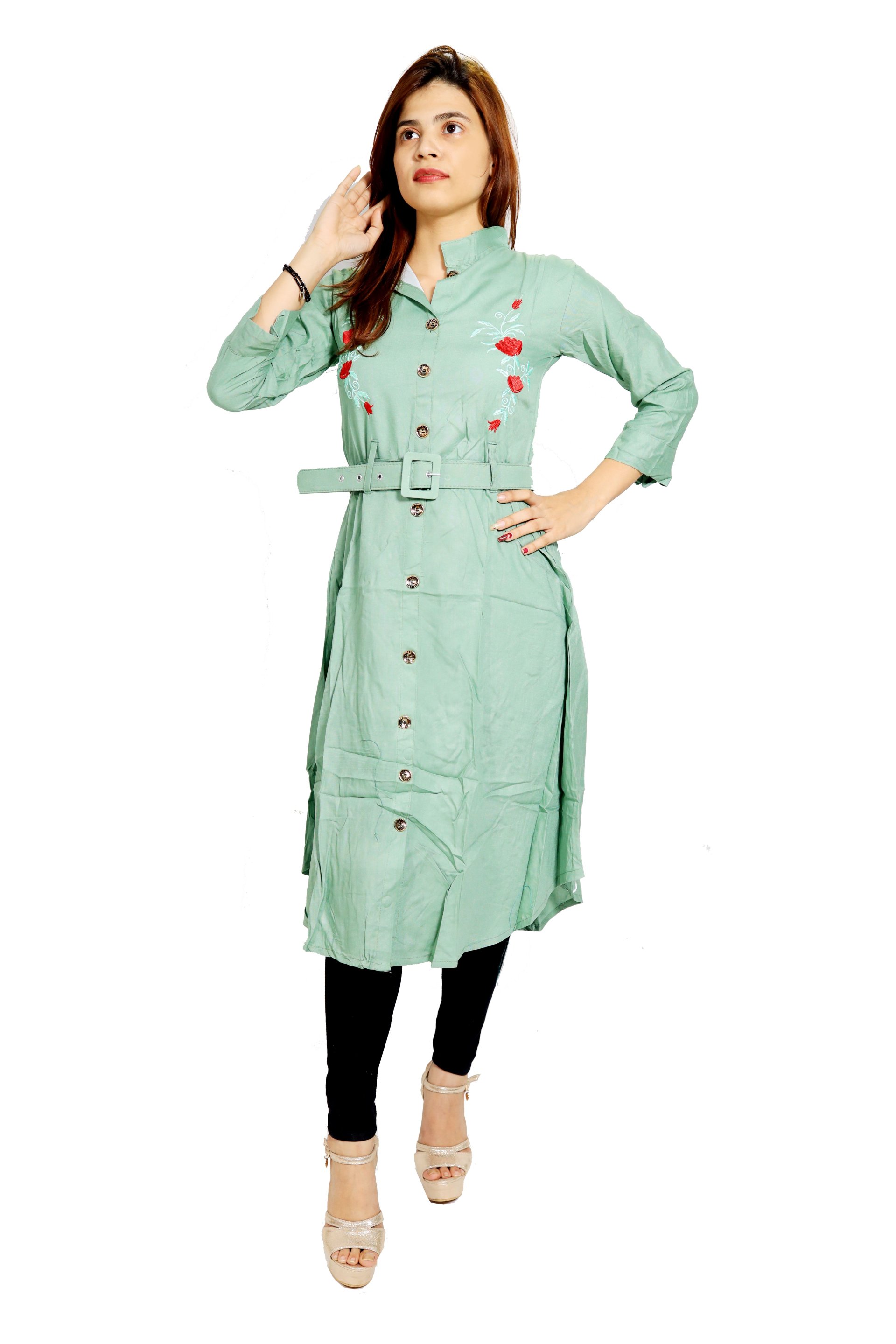 Red flower embroided straight Kurti for Womens/ girls (Green Kurti) - Made up of Rayon and designed for you plesant and comfy