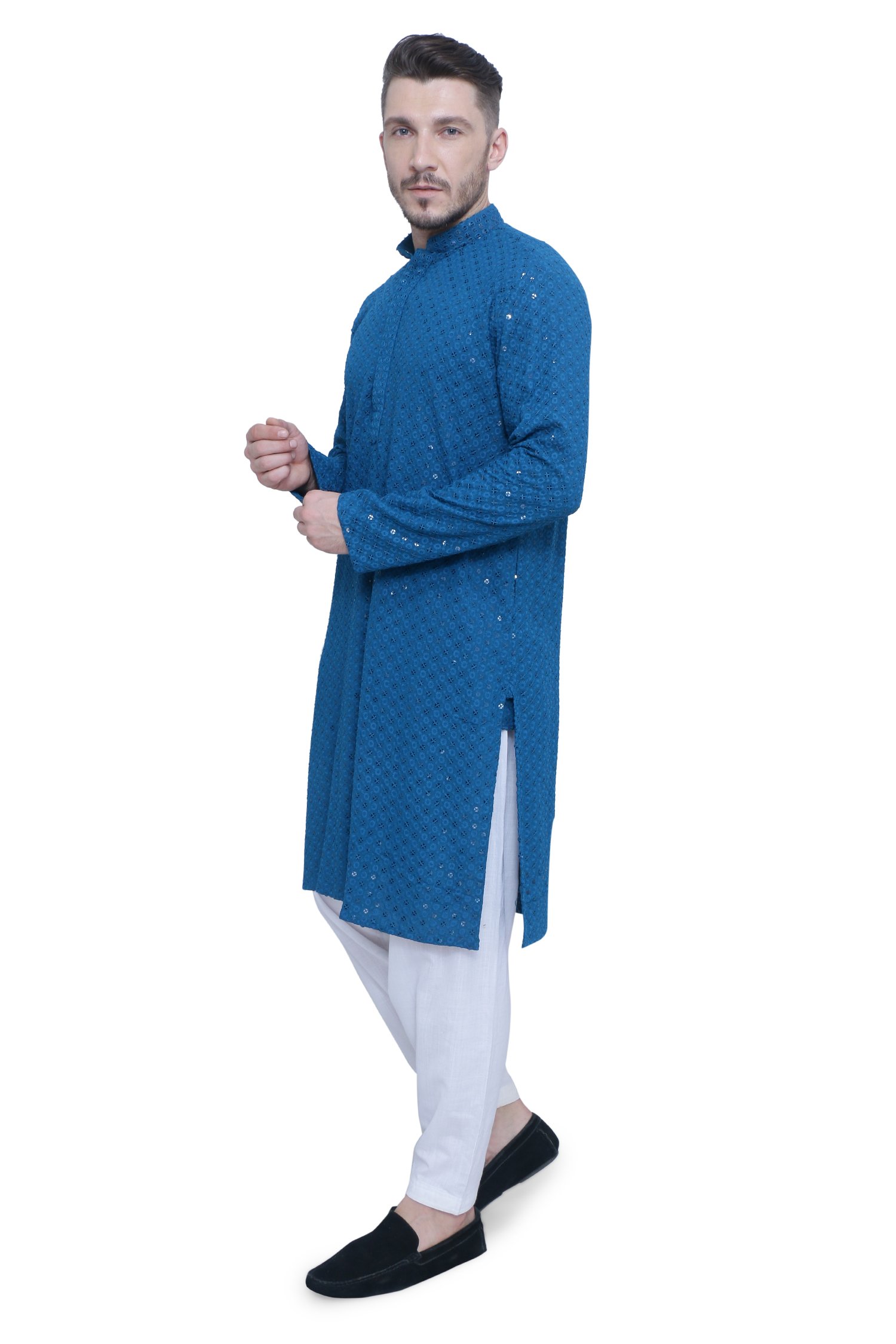 Elevate your ethnic wardrobe with our Exquisite Feroze Blue Chikankari Men's Kurta Set. Crafted from high-quality Chikankari fabric, this ensemble offers unparalleled comfort. The striking Feroze Blue color exudes a vibrant and unique style, and the intricate chikankari embroidery adds a touch of traditional craftsmanship. With the addition of the Feroze Blue color, your collection is now even more diverse and appealing to a wider range of customers. This description highlights the unique qualities of this new color variant.
